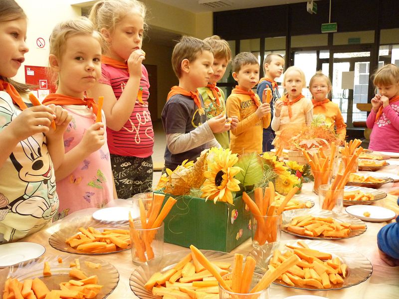 29-10 odbyła się kolejna akcja zdrowia dla całego przedszkola tym razem pod hasłem: „Marchewkowe witaminy na marchewki urodziny”. Biletem wstepu tego dnia był strój pomarańczowy. Tym razem „Pani Marchewkowa” uczyła dzieci co kryje się w marchewkach, poznaliśmy bajkę o królowej marchewkowej, która nie chciała już chorować. Dowiedzieliśmy się od Mądrej Sowy o wartościach dla zdrowia kryjących się w marchwi, jedliśmy zdrowe paluszki marchewkowe, próbowalismy marchew surową, szukaliśmy na obiedzie marchewki gotowanej, ozdabialiśmy w grupach duże sylwety marchewek, a do domu znów czestowaliśmy się marchewkami, zabierajac je w torebki. Wszyscy otrzymali tego dnia sok marchewkowy. Marchew dostarczyli dzień wcześniej do akcji Rodzice. Dziekujemy po raz kolejny za pomoc w akcji zdrowia.