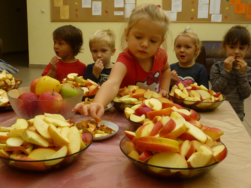 8-10 odbyła się II Akcja serii Jesień zdrowie w koszu niesie pt.: „Jabłuszko rumiane słońcem malowane”. Tego dnia Pani „Czerwonkowa” uczyła dzieci, co kryją w sobie jabłka, które są najzdrowsze, poznaliśmy ukryte w nich witaminy, byśmy mieli zdrowe miny; minerały i inne składniki tych cennych dla zdrowia owoców jesiennych.