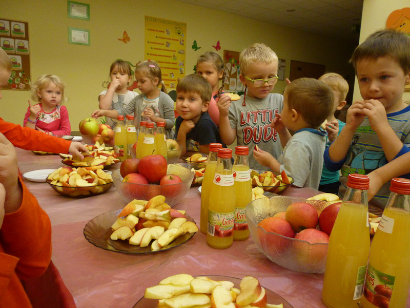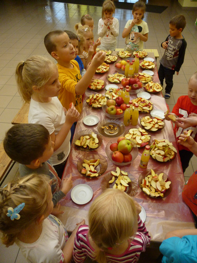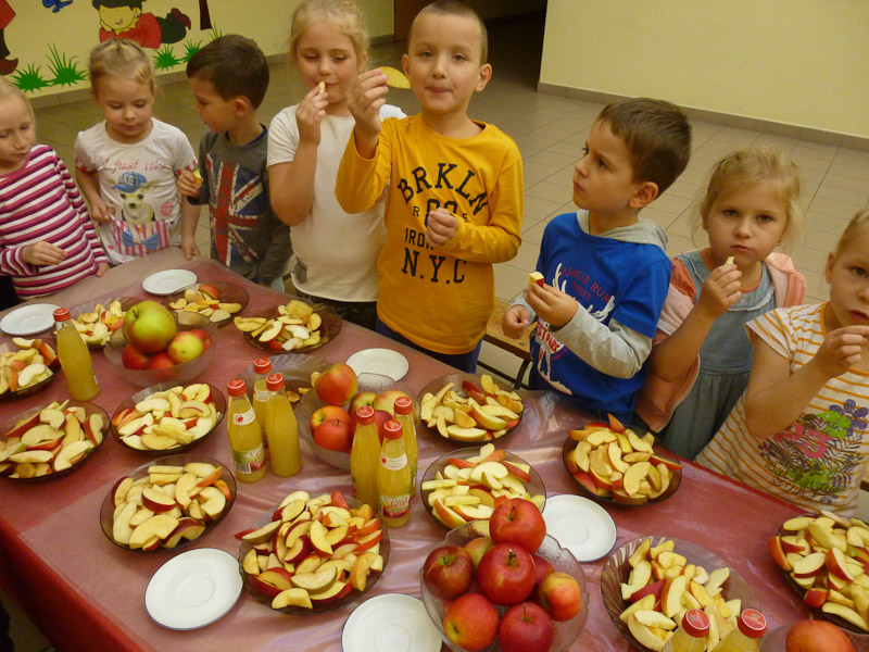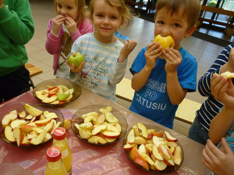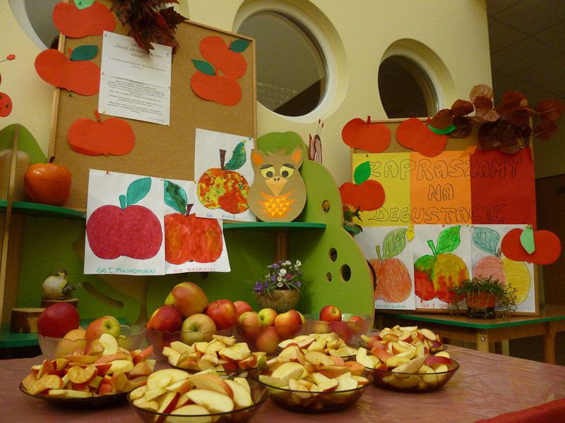 8-10 odbyła się II Akcja serii Jesień zdrowie w koszu niesie pt.: „Jabłuszko rumiane słońcem malowane”. Tego dnia Pani „Czerwonkowa” uczyła dzieci, co kryją w sobie jabłka, które są najzdrowsze, poznaliśmy ukryte w nich witaminy, byśmy mieli zdrowe miny; minerały i inne składniki tych cennych dla zdrowia owoców jesiennych.