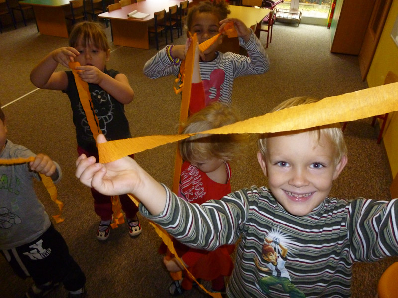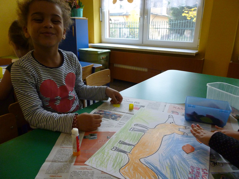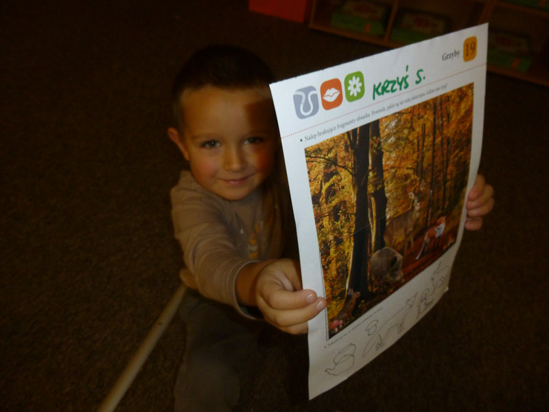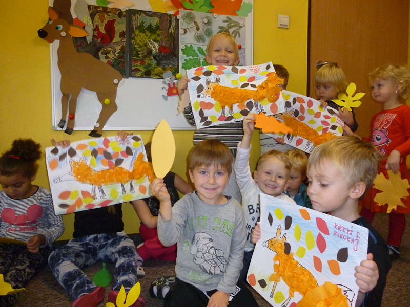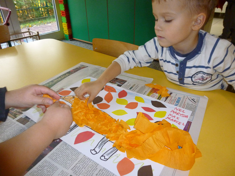 Kwiatuszki przeniosły się tego dnia w wyobraźni do lasu, poznawały leśne owoce drzew, zwierzęta lasu, uczył nas znajomy jeż Julek, a bawił wesoły lisek. Bawiliśmy się tego dnia w liska z „liskowymi” ogonkami z bibułki, składaliśmy leśne puzzle naklejając elementy obrazka, a także wykonaliśmy wspólnie duże prace plastyczne pt.: „Lisek jesienią w lesie”