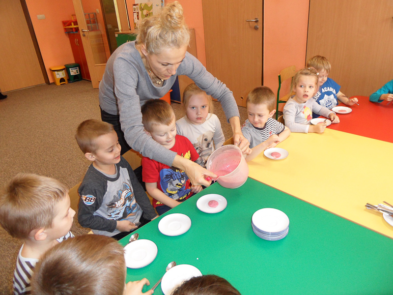 Misie zdrowe lody zjadają. Dzięki mamie Nadii z okazji urodzin Nadusi tego dnia powstały w grupie smakowite zdrowe lody zmiksowane z jogurtu naturalnego, malin, bananów i syropu z mniszka lekarskiego.