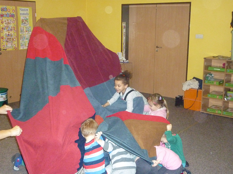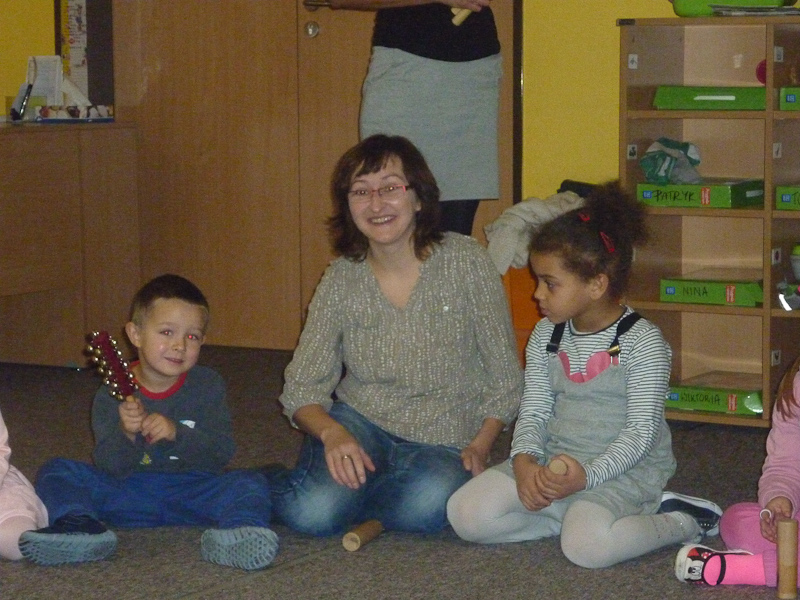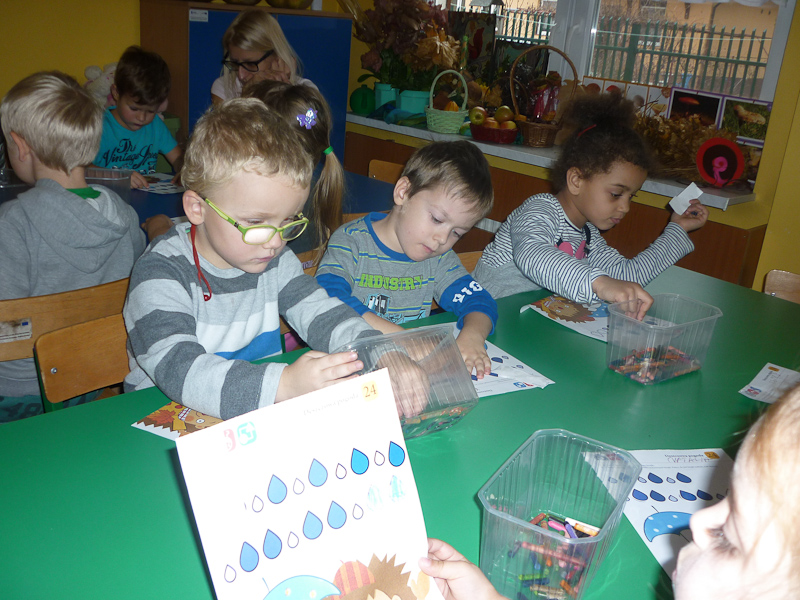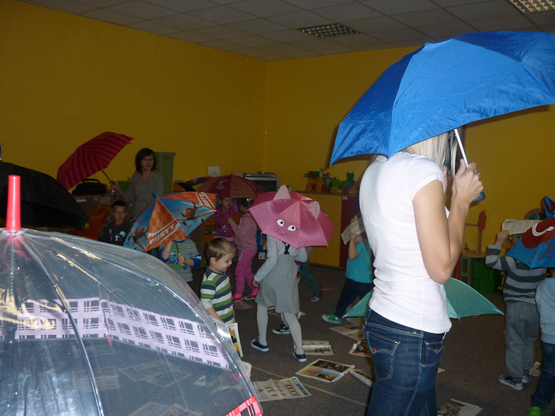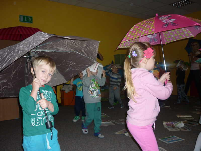 Tego dnia z rodzicami na zajęciu wspólnym otwartym bawiliśmy się wesoło przy wierszach i piosenkach. Była deszczowa gimnastyka, spacer w deszczu z parasolami, szukanie kałuży, deszczowa orkiestra z instrumentami muzycznymi do piosenki „Deszcz muzyczny grajek” oraz zabawy z chustą animacyjną zastępująca ogromny parasol, który schował wszystkich przed deszczem. Na koniec deszcz wygrywał kropelkowy rytm, który naklejaliśmy na karcie pracy.