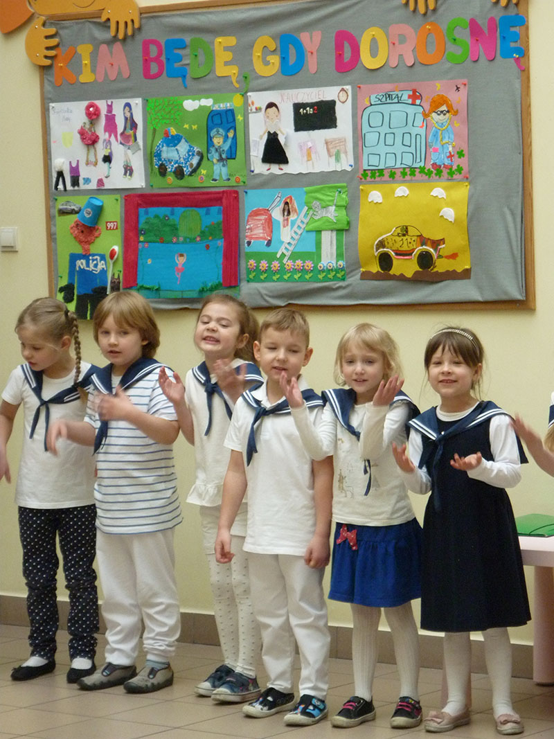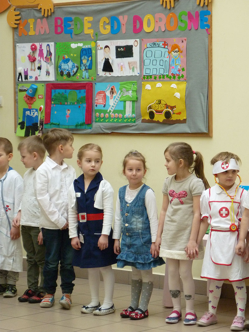 29 marca na terenie naszego przedszkola odbyło się rozstrzygnięcie konkursu plastycznego :"KIM BĘDĘ, GDY DOROSNĘ" w ramach projektu ogólnopolskiego - Poznajemy zawody świata i osób dorosłych widziane oczami dziecka. I miejsce - Lena Grałka, Nikola Piech, II miejsce - Grzegorz Woźniak, Julia Jòźwiak, III miejsce - Paweł Pluciński, Marika Piech, Dawid Putkowski. Aby uatrakcyjnić ten dzień odbyły się występy wszystkich grup. Dzieci zaprezentowały przed publicznością wiersze i piosenki o zawodach.