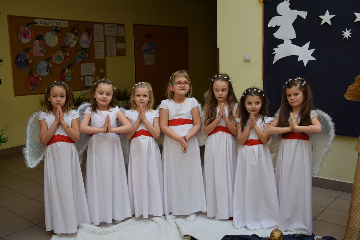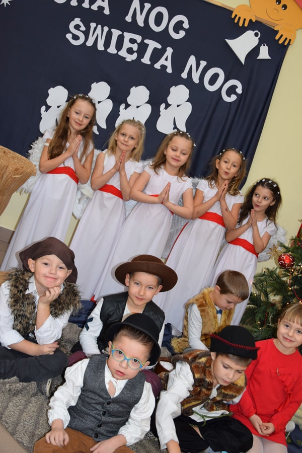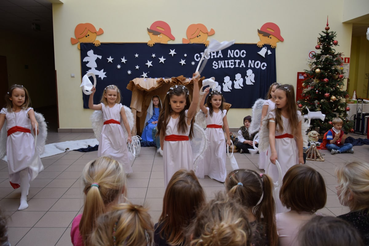 Uroczystość Jasełek od wielu lat wpisana jest do kalendarza uroczystości organizowanych w naszym przedszkolu. Mali aktorzy, we wspaniałych strojach pięknie prezentowali się na tle bożonarodzeniowej dekoracji – stajenki z Józefem, Maryją i Dzieciątkiem. Z dużym przejęciem i zaangażowaniem wiernie odtwarzali swoje role, prezentowali umiejętności recytatorskie i wokalne. Całej tej uroczystości towarzyszyła przepiękna gama kolęd i pastorałek granych na gitarze przez zaprzyjaźnioną siostrę. Jasełka obejrzały przedszkolaki, pracownicy przedszkola oraz zaproszeni goście. Swoją obecnością uraczyli nas również emerytowani pracownicy przedszkola. Kolejny raz okazało się, że takie wspólne spotkania, emocje i przeżycia zbliżają ludzi, a dzieciom pokazują jak ważna jest tradycja świąt Bożego Narodzenia i jak bardzo rodzinne jest to święto.