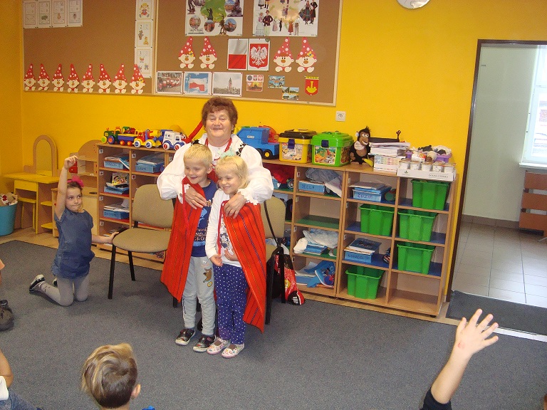 Panie ubrane w regionalny strój ziemi dobrońskiej wzbudziły u dzieci duże zainteresowanie. Pani Ania prezentowała elementy garderoby: wełnianą spódnicę, wełnianą zapaskę, bluzkę, wyszywany cekinami gorset, buty i wełniane okrycie wierzchnie na zimne dni. Ciekawostką było, że stroje przekazywane są z pokolenia na pokolenie i mają ponad sto lat.