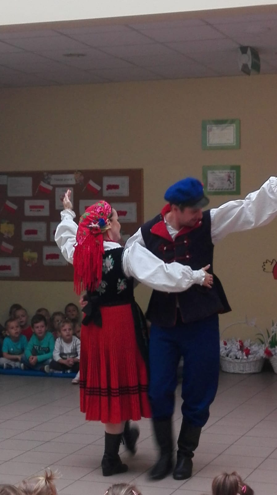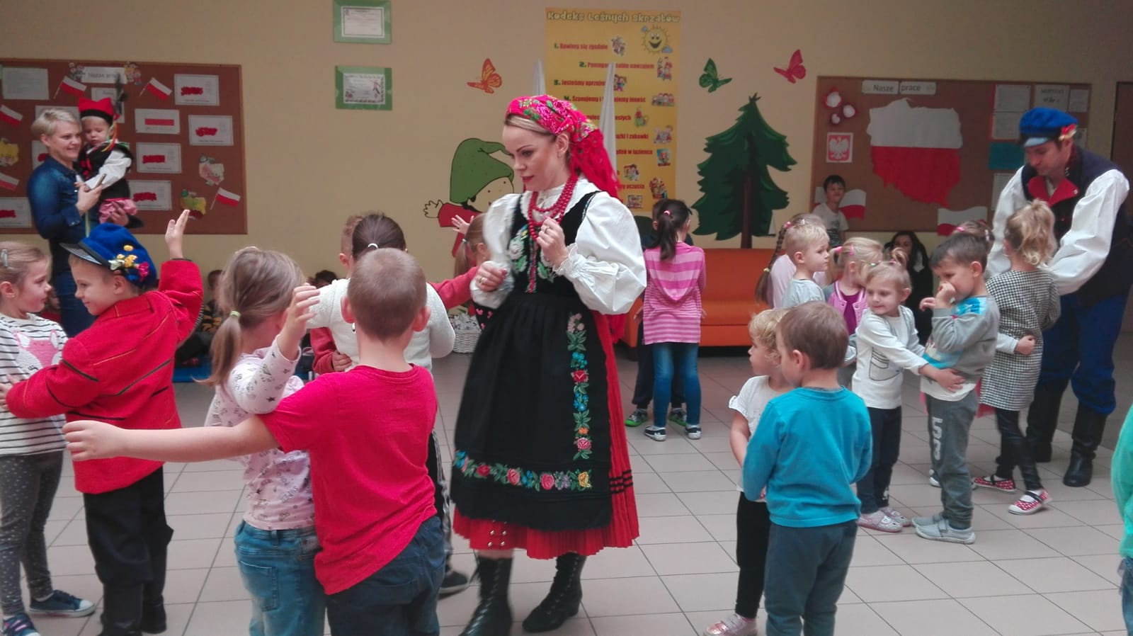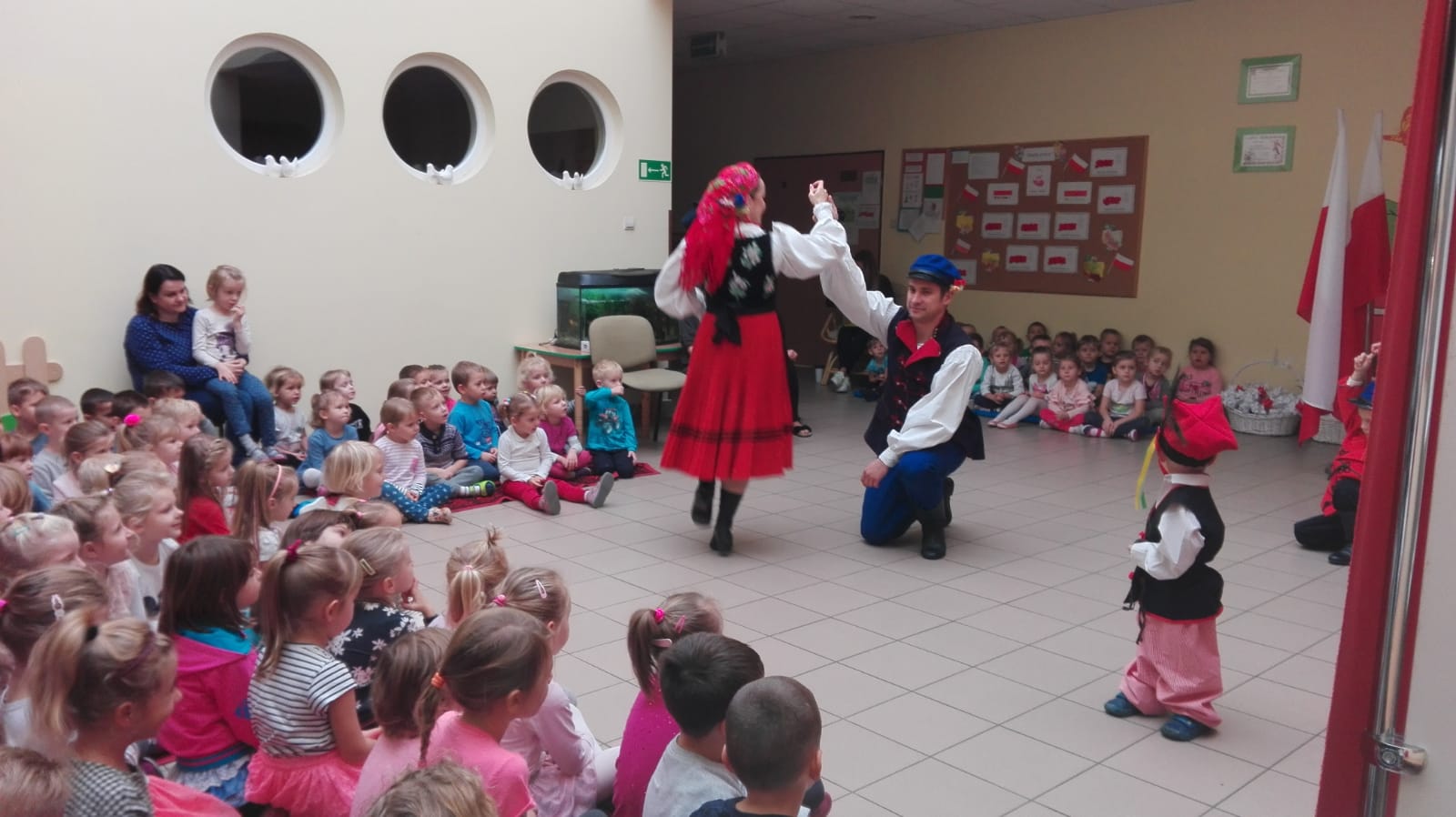W dniu 05.11.2018r. odwiedzili nas w przedszkolu Rodzice z Zespołu Pieśni i Tańca w Dobroniu- Państwo Śmiałek (rodzice dziecka z grupy "Misie"). Przybliżyli nam popularny taniec ludowy "Krakowiak". Zaprezentowali także przepiękne stroje ludowe, które są ogromną dumą dla naszego kraju. Zachwycone Przedszkolaki aktywnie uczestniczyły w nauce tańca ludowego, a także bacznie śledziły każdy krok profesjonalistów! Dzięki takim spotkaniom mamy wielką możliwość umocnić się w przekonaniu jakże jest "PIĘKNA NASZA POLSKA CAŁA!". Leśne Skrzaty dziękują za odwiedziny!