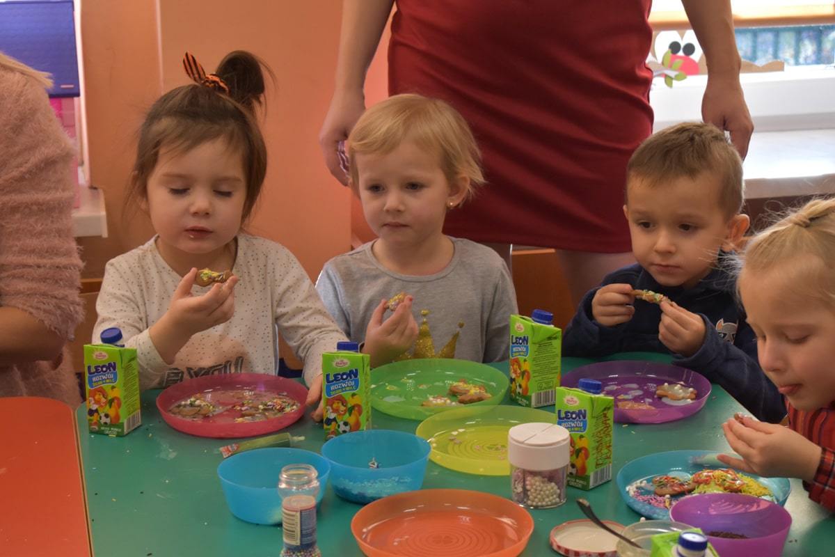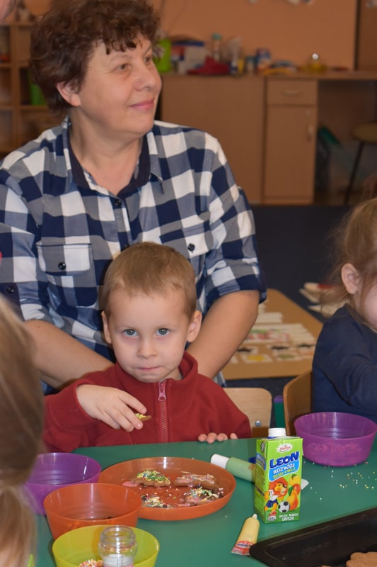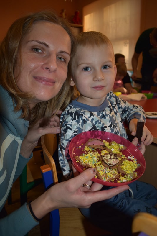 Był śpiew, taniec, zagadki i zadanie (łatwe i trudne). Podczas zajęć na twarzach wszystkich gościł uśmiech. Na zakończenie wspólnie dekorowaliśmy pyszne pierniczki, które ze smakiem na koniec spałaszowaliśmy.