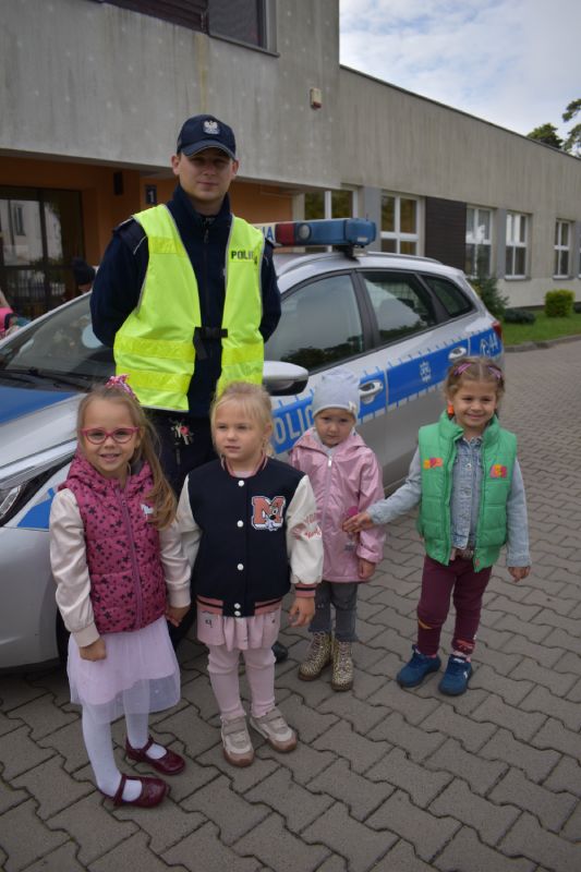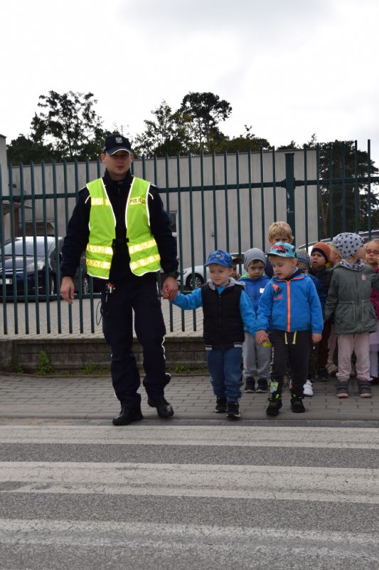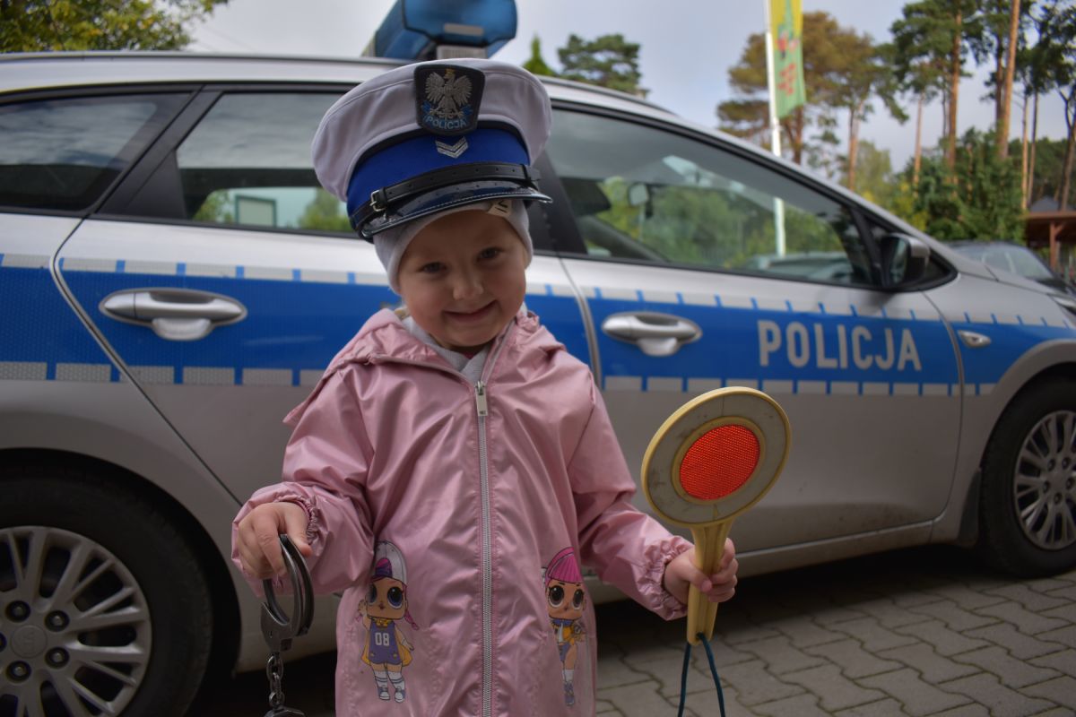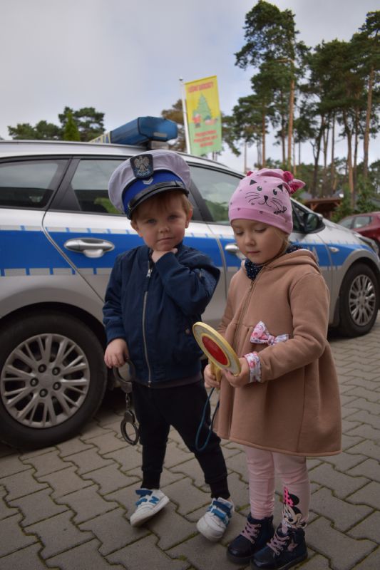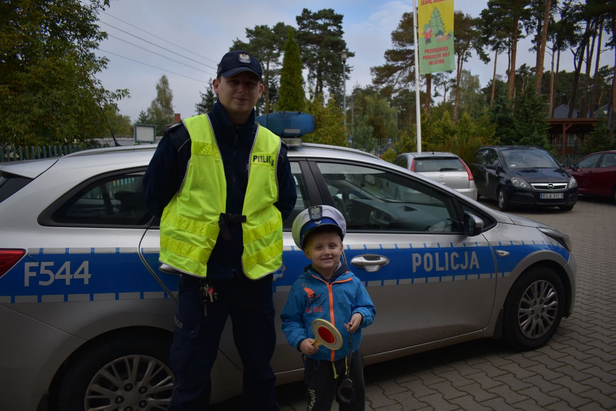 Wraz ze stróżem prawa poszliśmy na skrzyżowanie, gdzie w praktyce ćwiczyliśmy właściwe przechodzenie przez przejście dla pieszych. Dzieci zobaczyły prawdziwe policyjne kajdanki, które zaprezentował pan policjant, odznakę, a także z wielkim przejęciem przymierzały czapkę. Największą jednak atrakcją był samochód policyjny, który zaparkował na terenie naszego przedszkola. Dzieci miały okazję dokładnie obejrzeć radiowóz, a włączanie sygnałów alarmowych wzbudziło zachwyt. To był dzień, który na długo pozostanie w pamięci dzieci.
