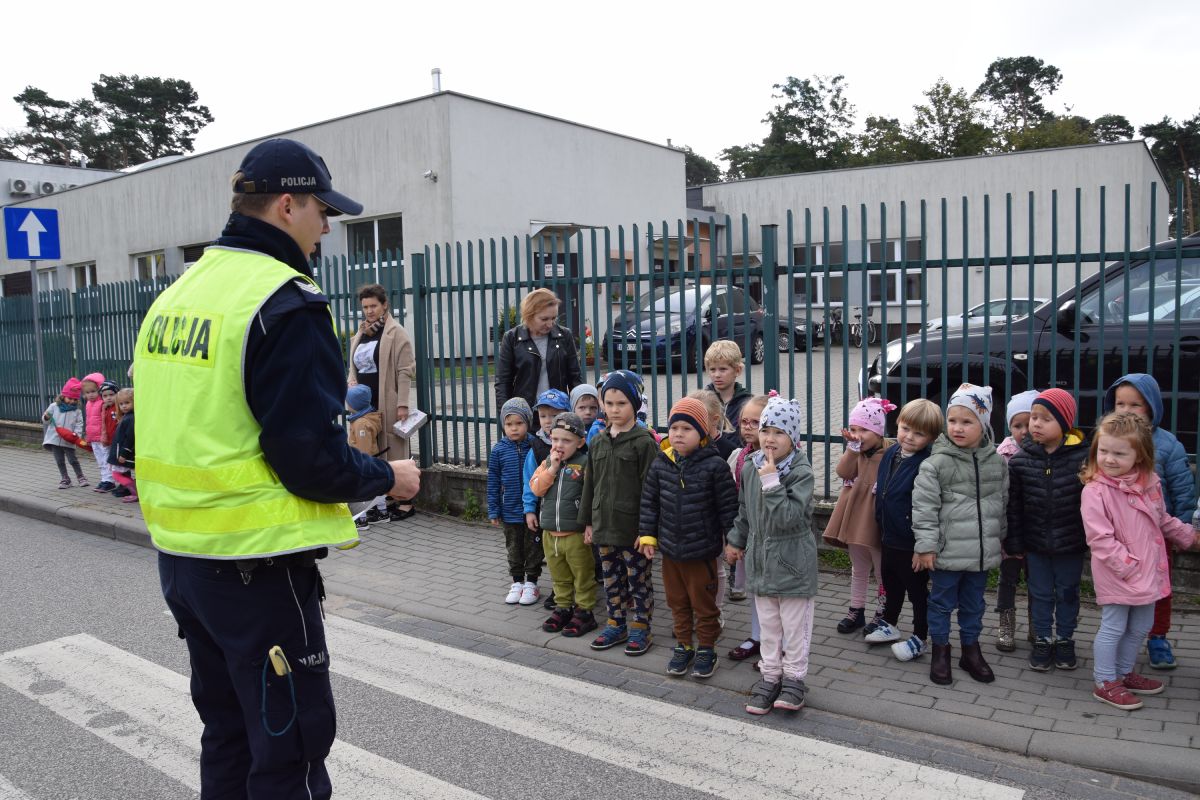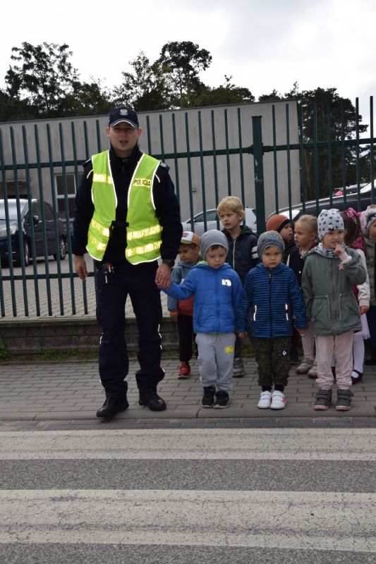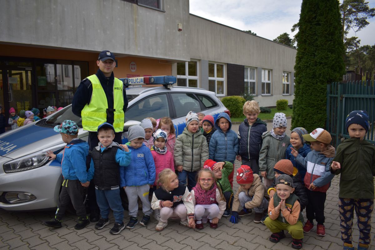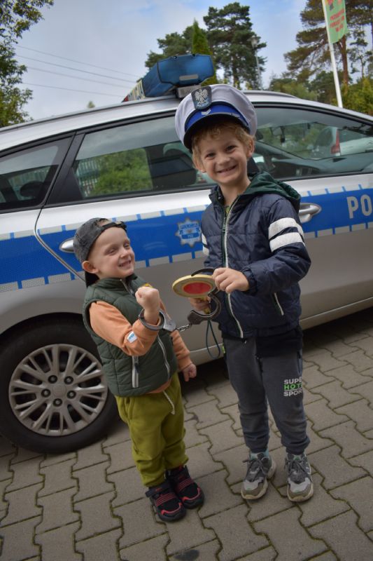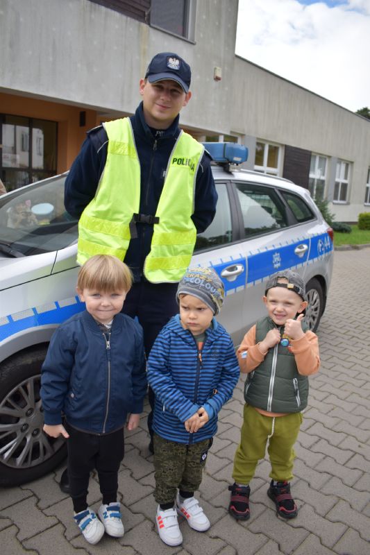Wraz ze stróżem prawa poszliśmy na skrzyżowanie, gdzie w praktyce ćwiczyliśmy właściwe przechodzenie przez przejście dla pieszych. Dzieci zobaczyły prawdziwe policyjne kajdanki, które zaprezentował pan policjant, odznakę, a także z wielkim przejęciem przymierzały czapkę. Największą jednak atrakcją był samochód policyjny, który zaparkował na terenie naszego przedszkola. Dzieci miały okazję dokładnie obejrzeć radiowóz, a włączanie sygnałów alarmowych wzbudziło zachwyt. To był dzień, który na długo pozostanie w pamięci dzieci.