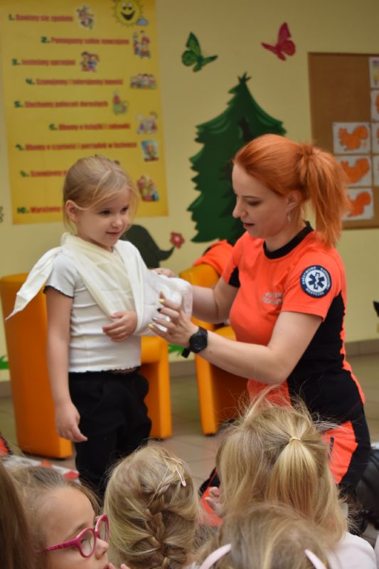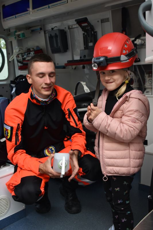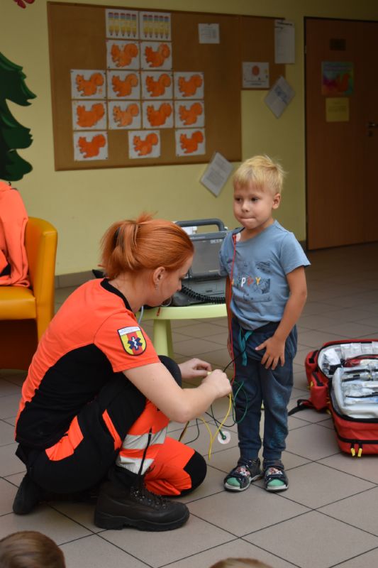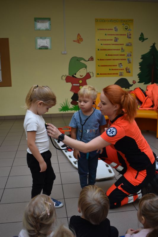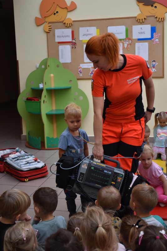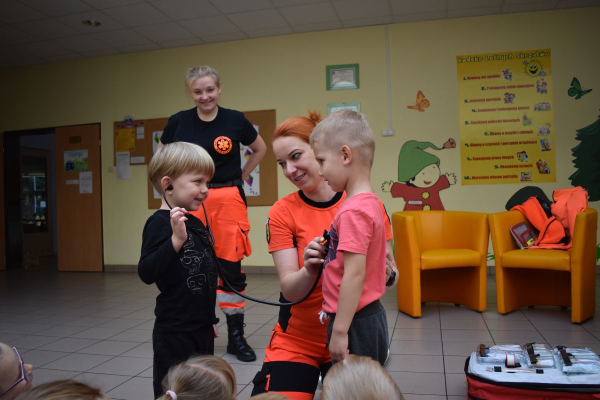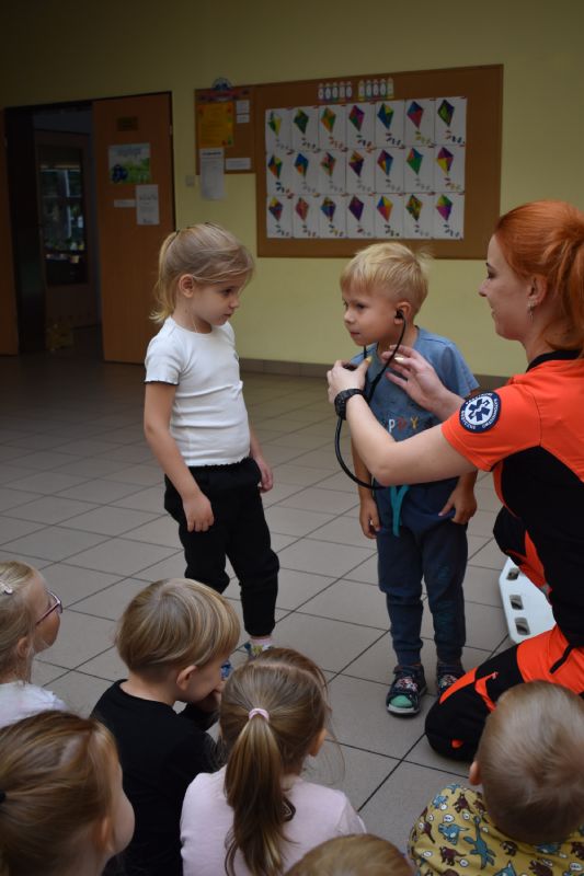Jako pierwsi odwiedzili nas ratownicy medyczni, którzy w ciekawy sposób opowiedzieli o swojej pracy. Następnie pokazali sprzęt medyczny, co odważni mogli sami stać się małymi „doktorami”, usłyszeć bicie serca swojego kolegi czy zajrzeć do karetki. Takie spotkanie na długo pozostanie w pamięci małych przedszkolaków.