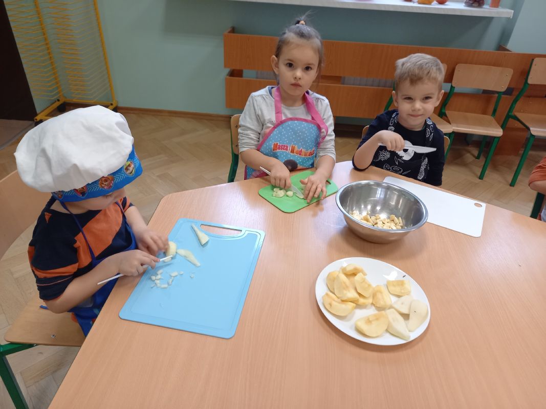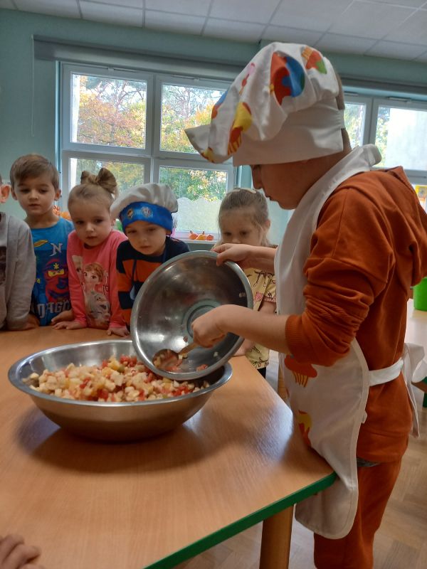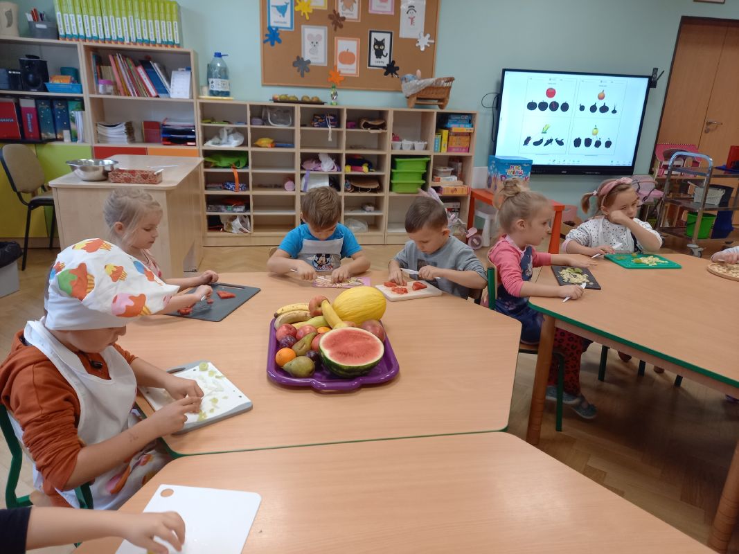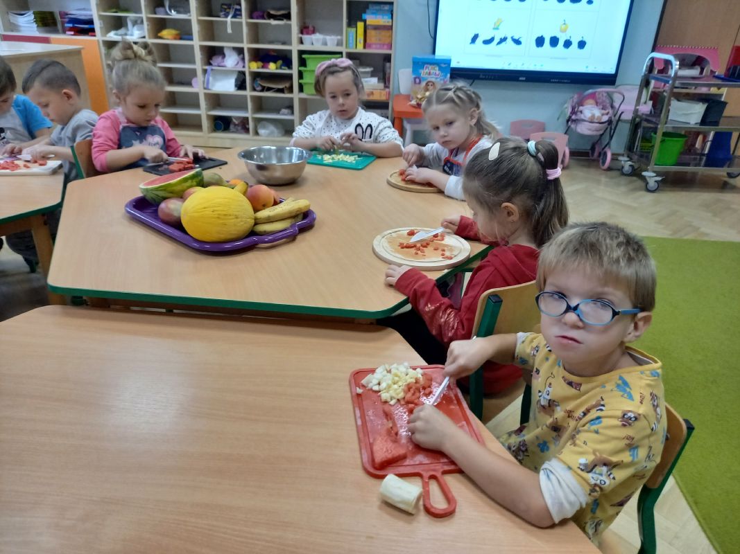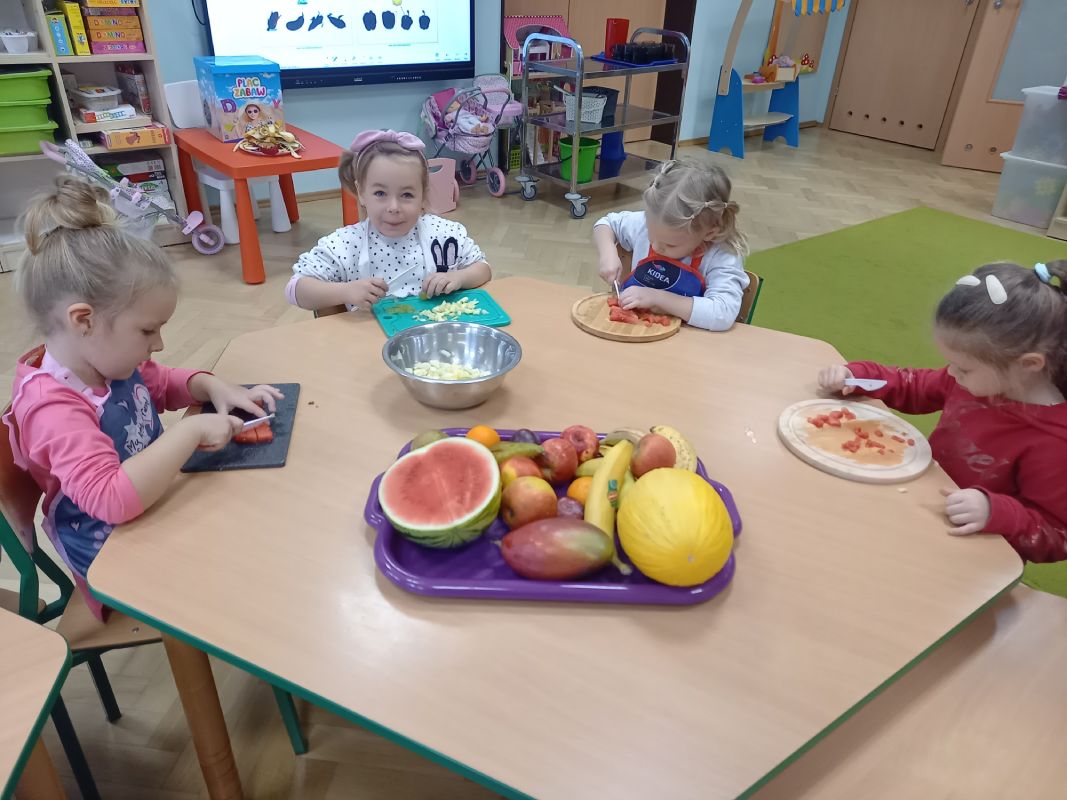 Edukacja prozdrowotna to ważny element pracy z dziećmi w przedszkolu. Wszyscy dobrze wiemy, ile pozytywów dla właściwego rozwoju dzieci niesie zdrowe odżywianie. Przedszkolaki z grupy „Jeżyki” przeobraziły się w wytrawnych kucharzy i miały okazję samodzielnie przygotować sałatkę owocową.