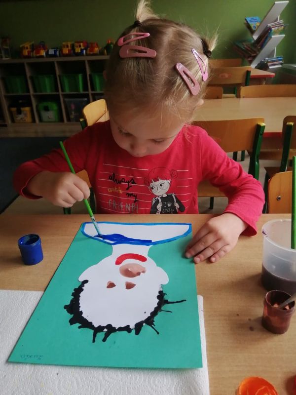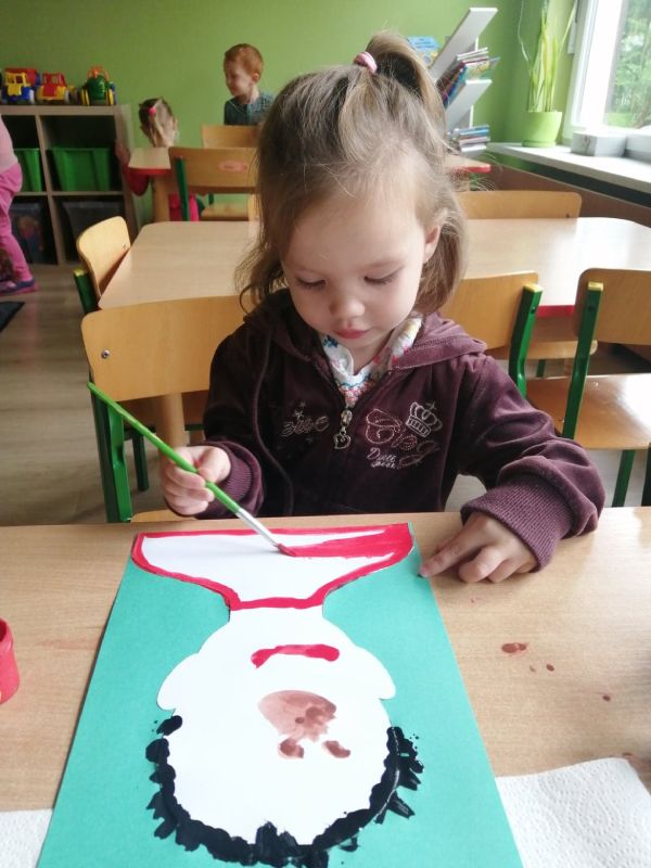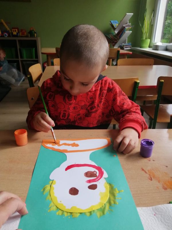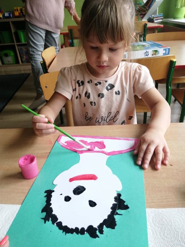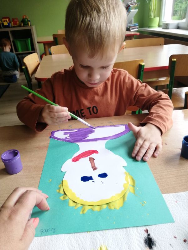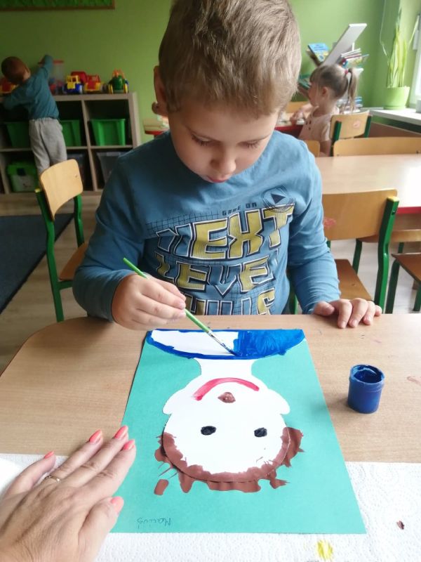 Dzieci z grupy „Wiewióreczki” swe portrety malowały, lecz by nudno nie było, na zwykłym malowaniu pędzelkiem się nie skończyło. Gdy farba w płynnej formie jeszcze była w ćwiczeniu oddechowym – dmuchaniu wnet w stojące dęba włosy się zamieniła! ;)