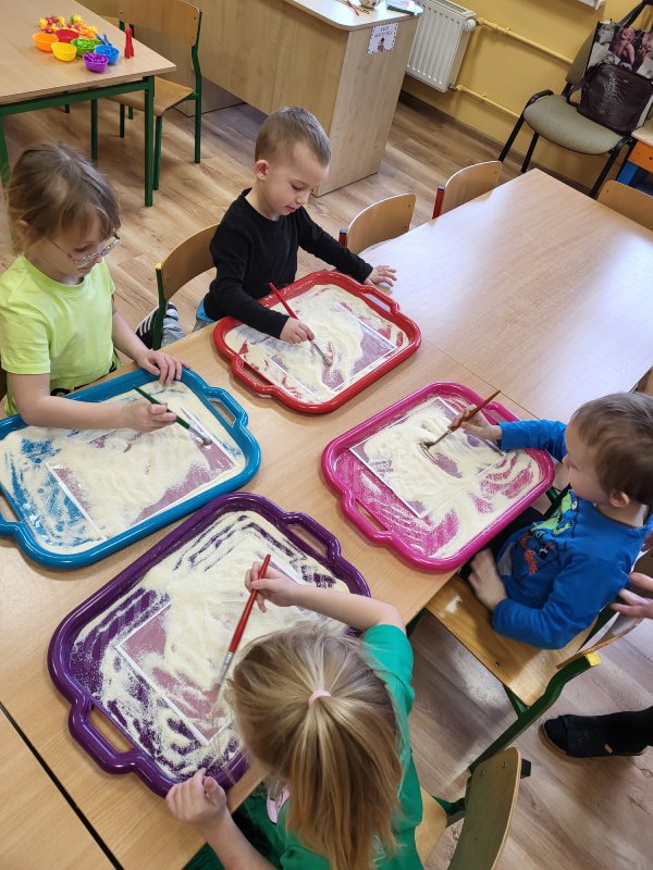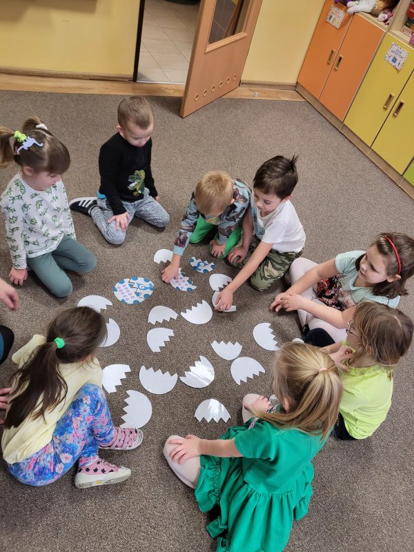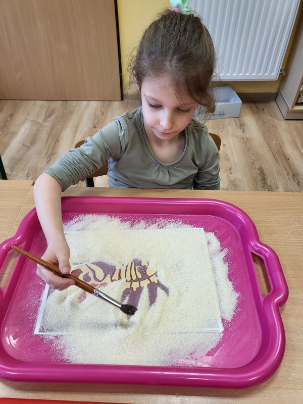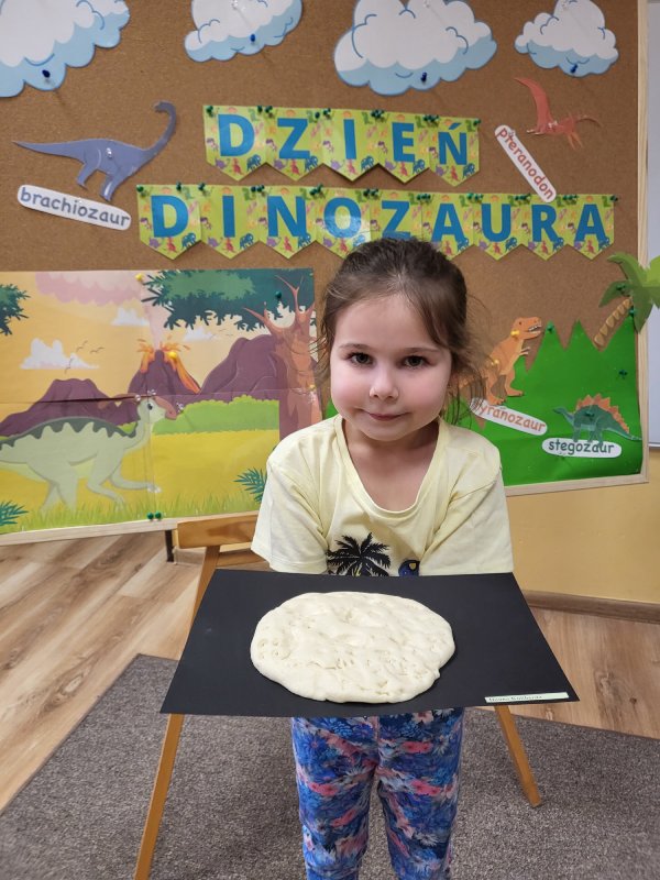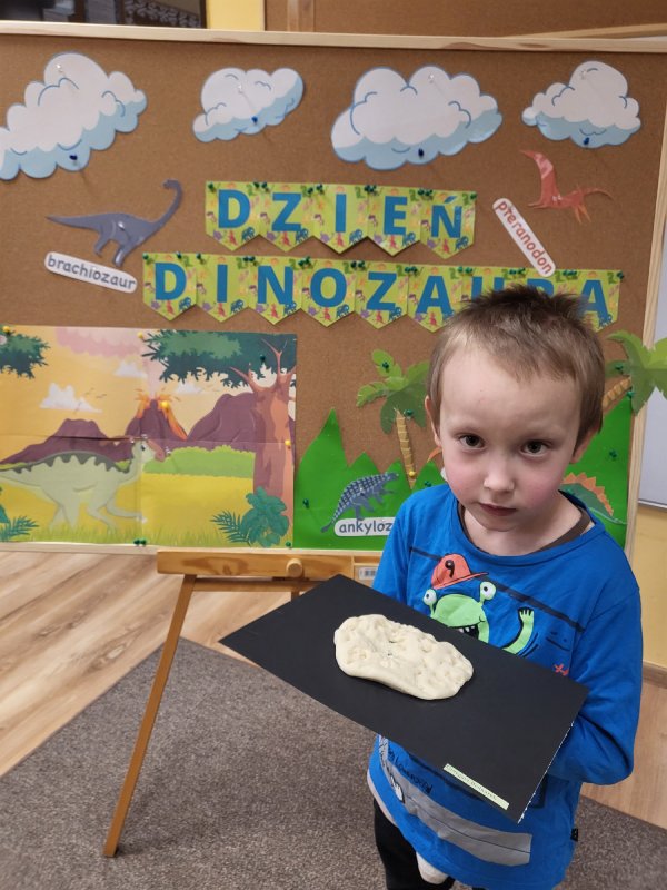Robiliśmy odciski dinozaura w masie solnej, graliśmy w „dinkowe memory” i zabawy ruchowe – naśladowanie danego dinozaura. Przy pomocy latarki sprawdzaliśmy, co kryje się w brzuchu dinozaurów… i okazało się, że niektóre jedzą tylko rośliny, inne tylko mięsko, a kolejne rybki ! Zamieniliśmy się też w archeologów – za pomocą pędzla odkrywaliśmy szkielety dinozaurów. Grupa „Motylki” bardzo interesuje się dinozaurami - zna większość nazw, ich upodobania i charakterystyczne dla nich zachowania, dlatego ten dzień dla naszej grupy jest tak bardzo szczególny.