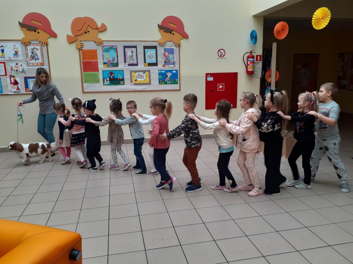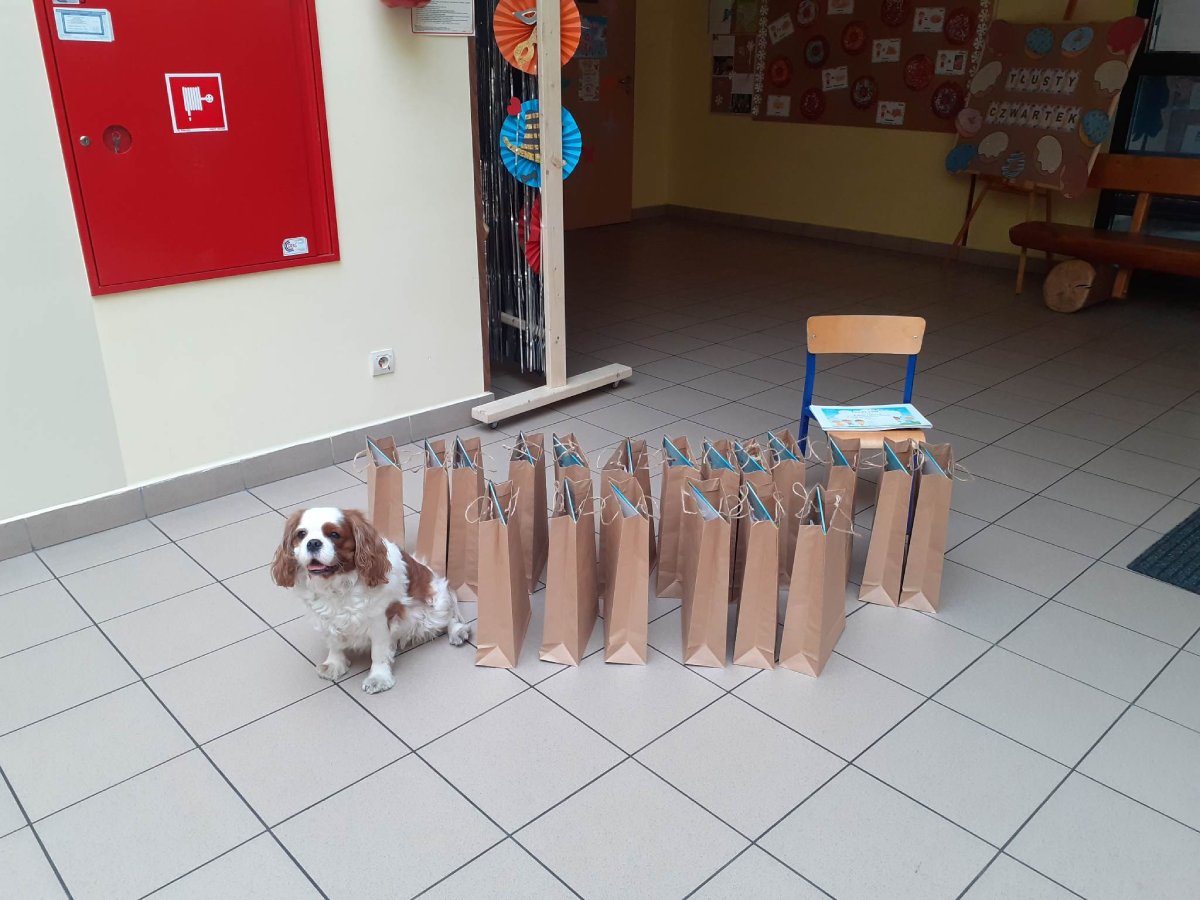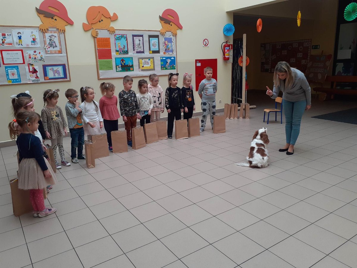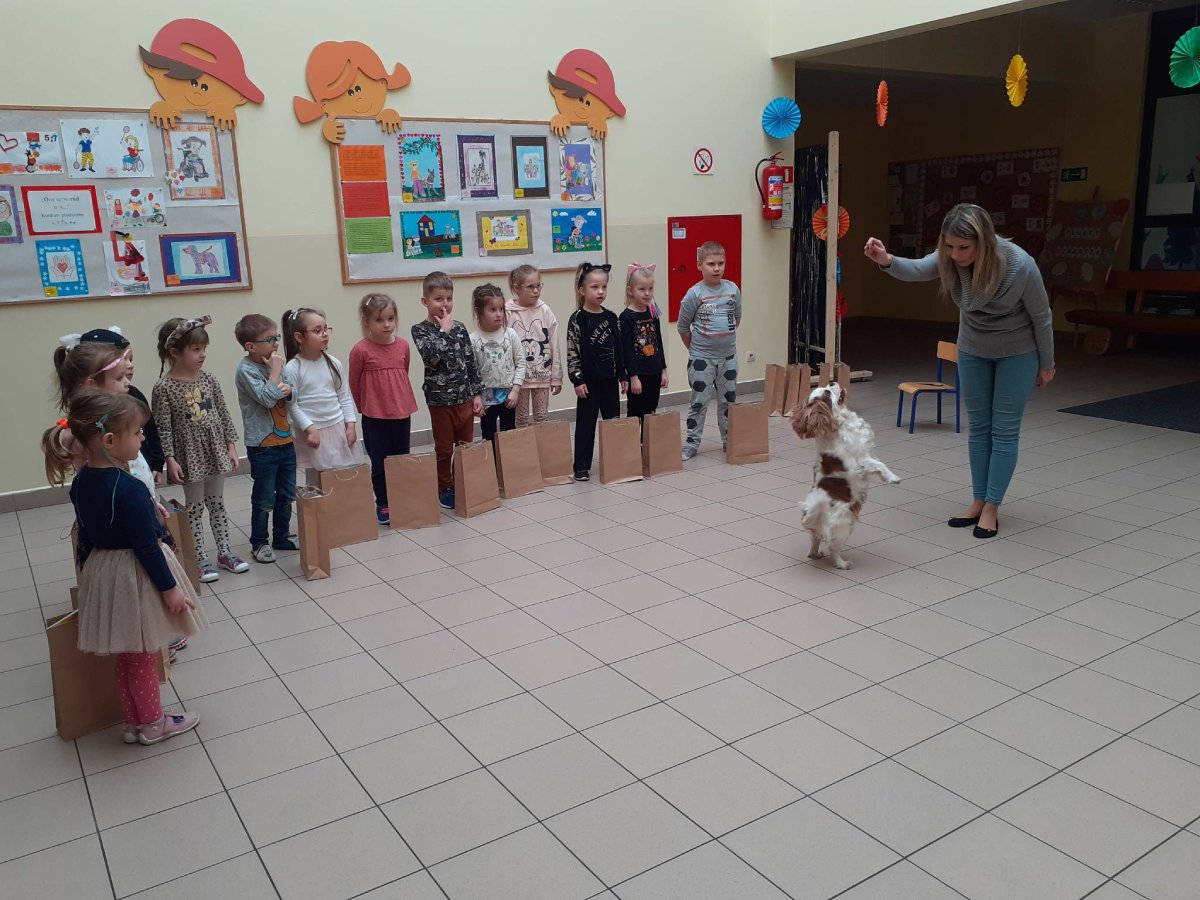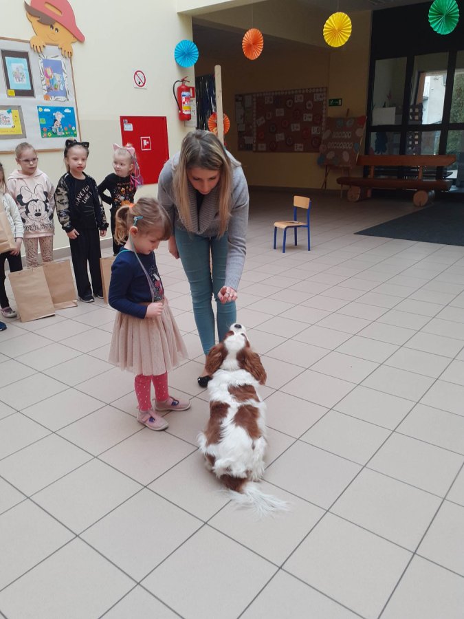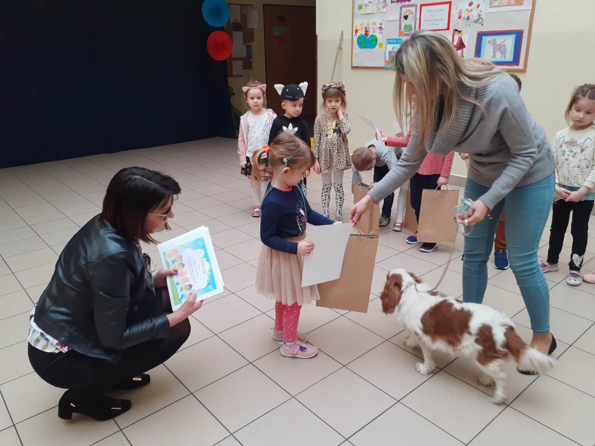 Podczas rozstrzygnięcia konkursu asystentem był pies – „przewodnik”, który w naszym przedszkolu bierze udział w zajęciach dogoterapii. W ramach dodatkowej atrakcji laureaci konkursu zobaczyli pokaz psich umiejętności i sami mogli spróbować swoich sił w roli psiego trenera ;)