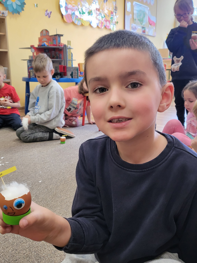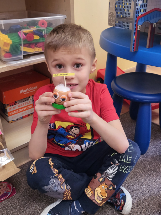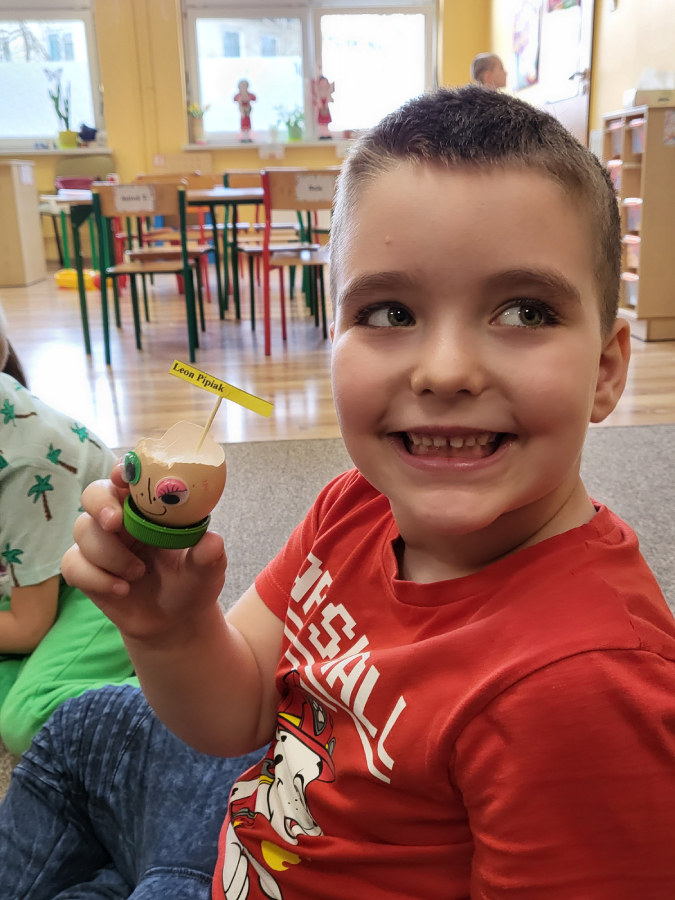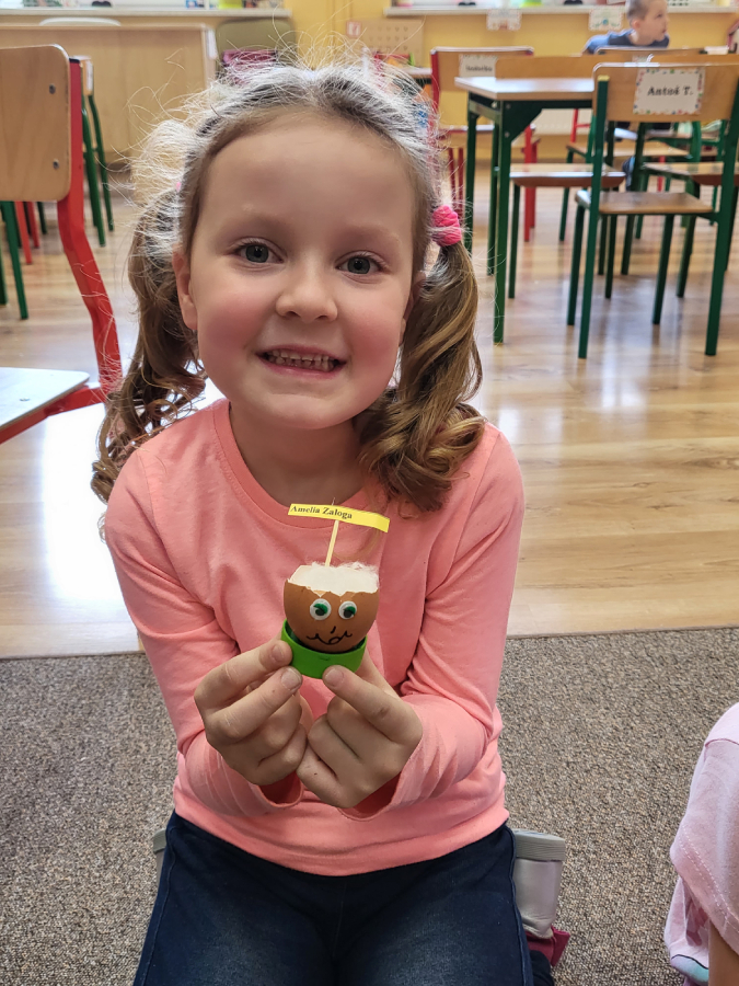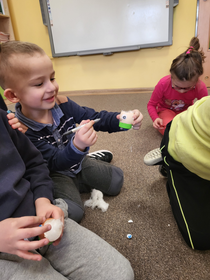 Wszyscy wiemy nie od dziś, że skorupki są bardzo delikatne, szybko pękają, jednak daliśmy radę i każdy z nas przygotował wesołą skorupkę z ruchomymi oczkami, uśmiechnięta buzią i włosami, które mamy nadzieję, że w ciągu tygodnia pięknie urosną!