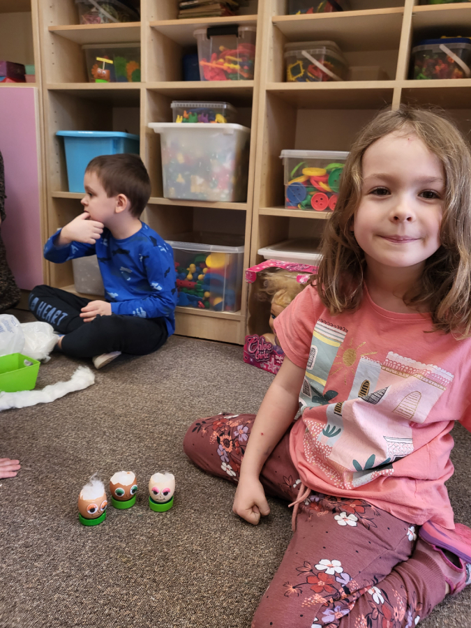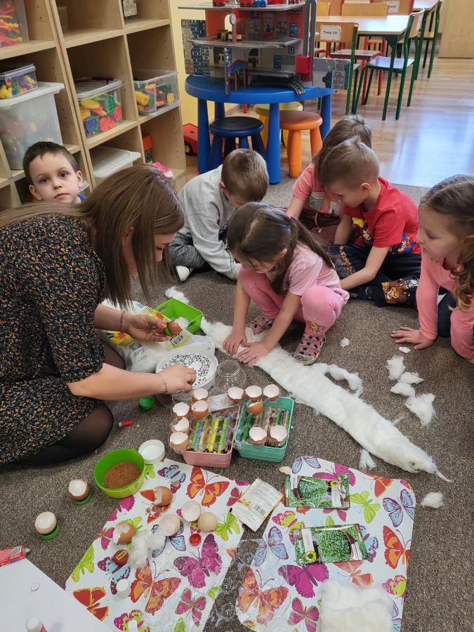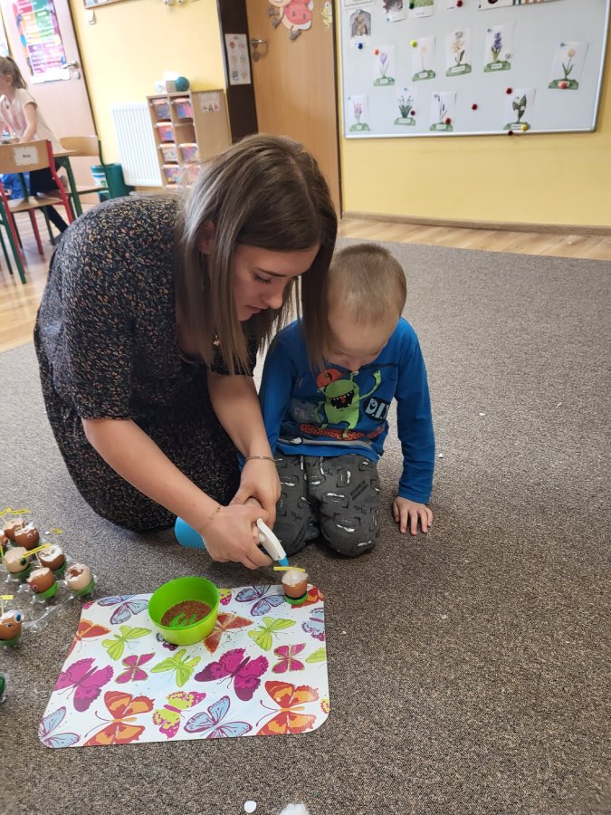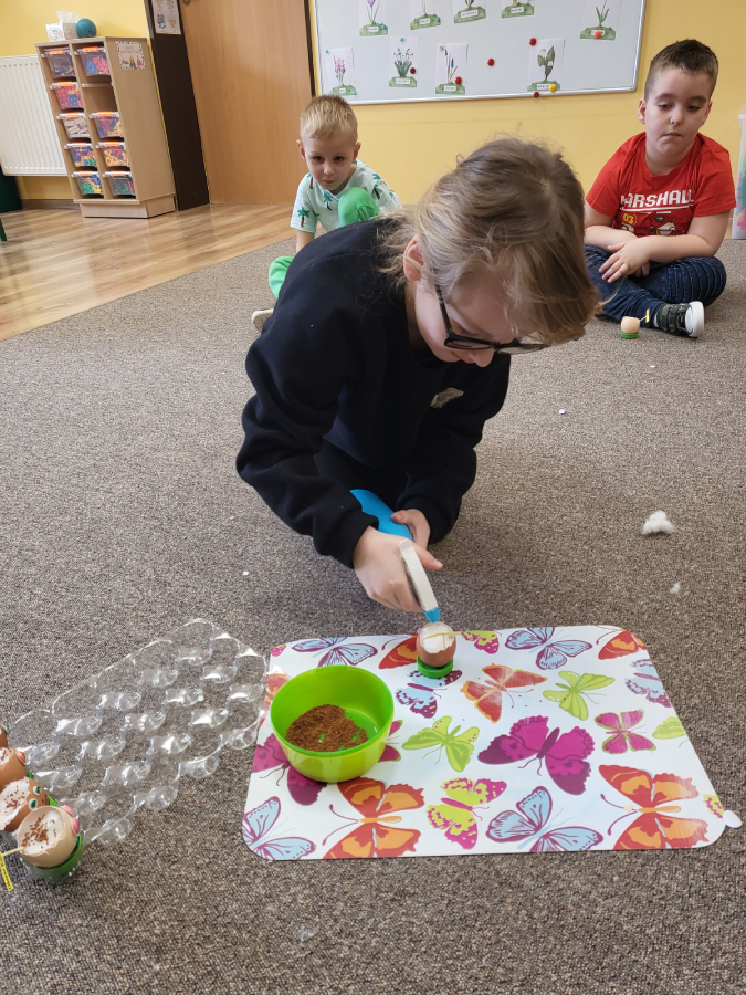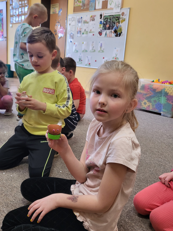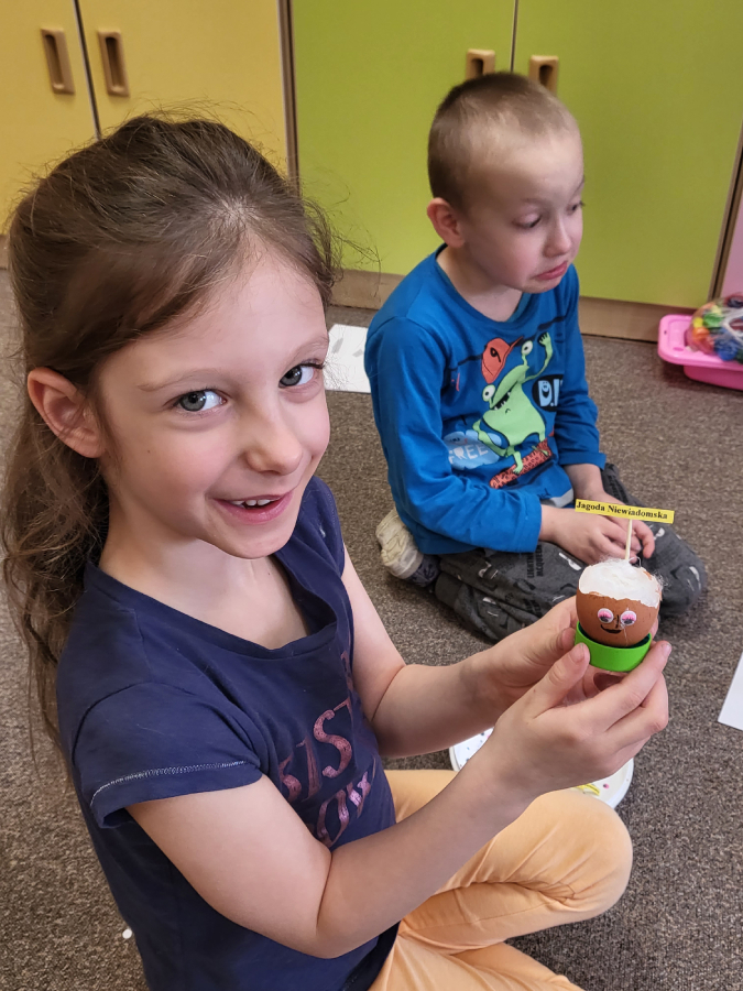 Wszyscy wiemy nie od dziś, że skorupki są bardzo delikatne, szybko pękają, jednak daliśmy radę i każdy z nas przygotował wesołą skorupkę z ruchomymi oczkami, uśmiechnięta buzią i włosami, które mamy nadzieję, że w ciągu tygodnia pięknie urosną!