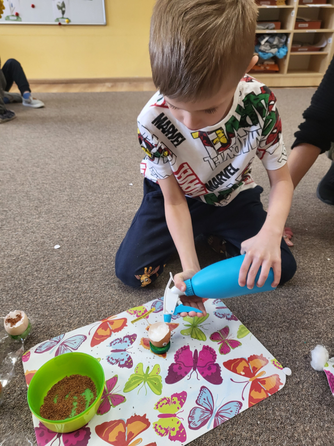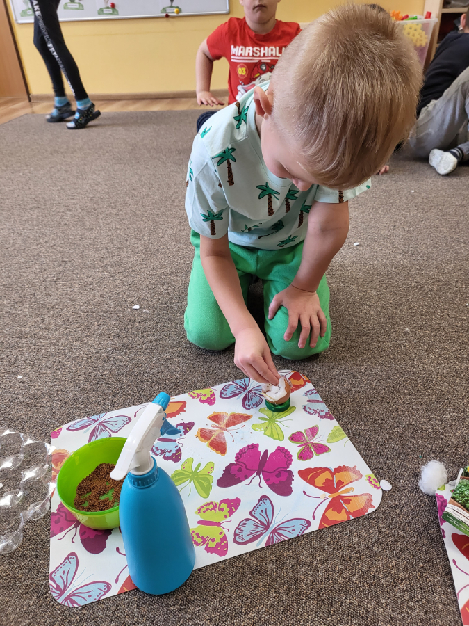 Nie było to łatwe zadanie, ponieważ zamiast kubeczków, pojemniczków sialiśmy ją do skorupek po jajkach, które zjedliśmy dzień wcześniej na śniadanko.