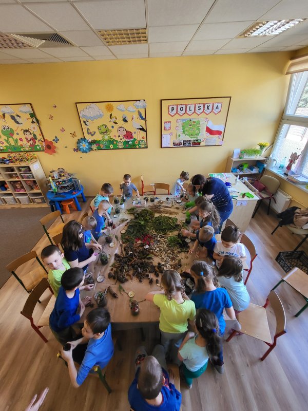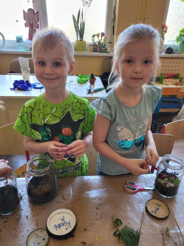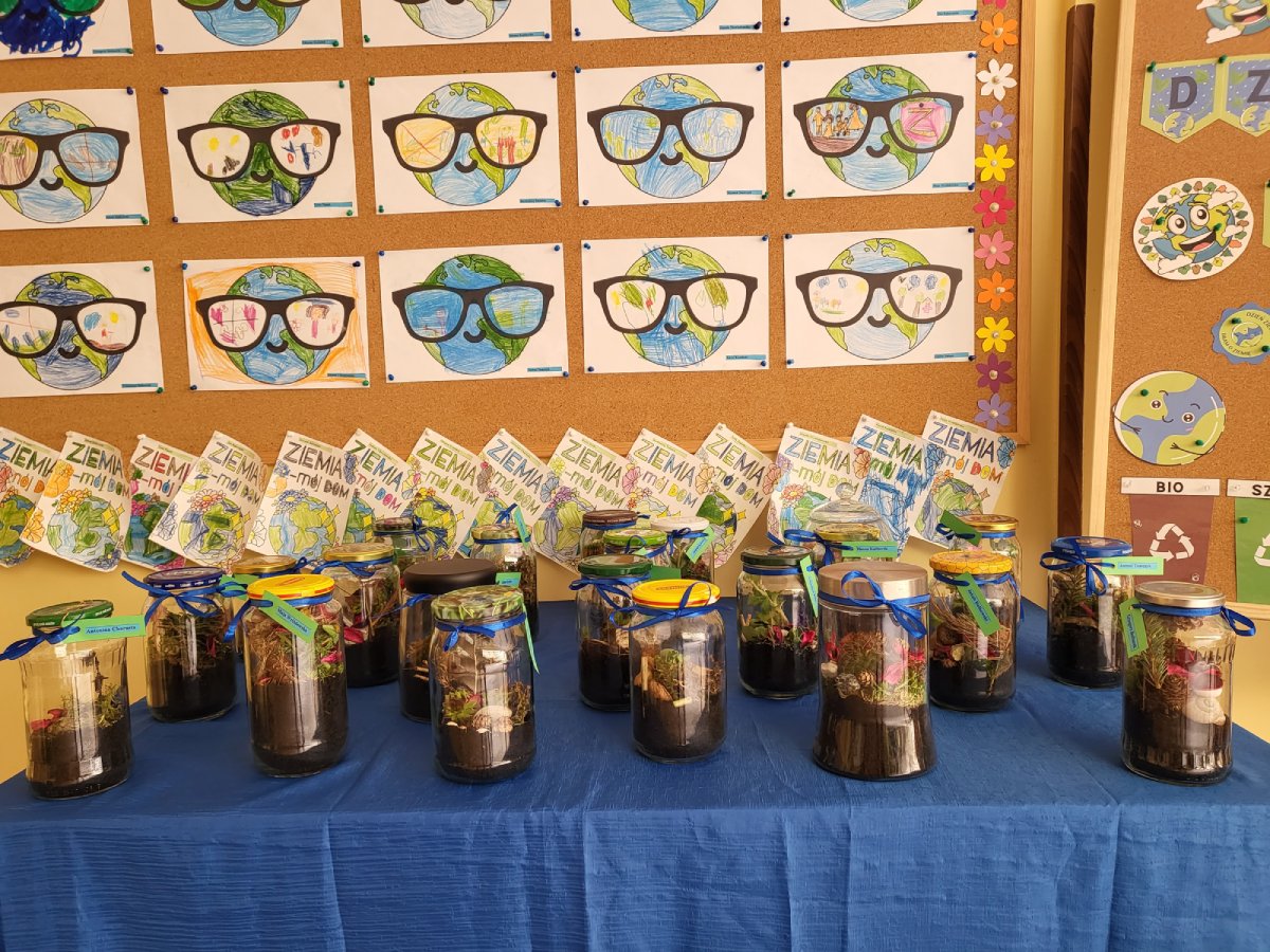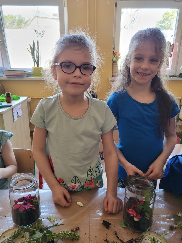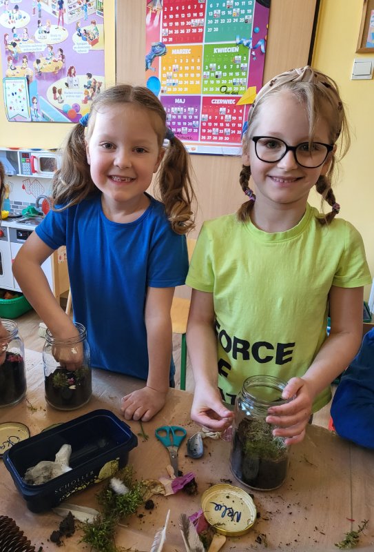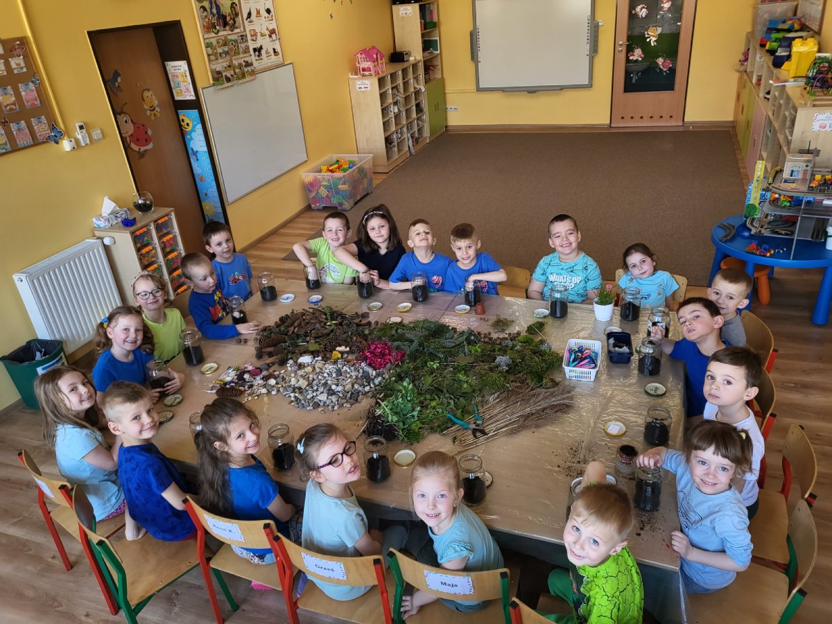 „Motylki” podczas spacerów z rodzicami zgromadziły leśne skarby, które następnie zostały wykorzystane do prawdziwego dzieła sztuki "Las w słoiku".