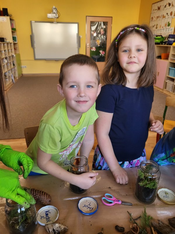 W calej sali unosił się piękny zapach prawdziwego lasu, a dzieci z dumą tworzyły, a nastepnie podziwiały swój las w słoiku.