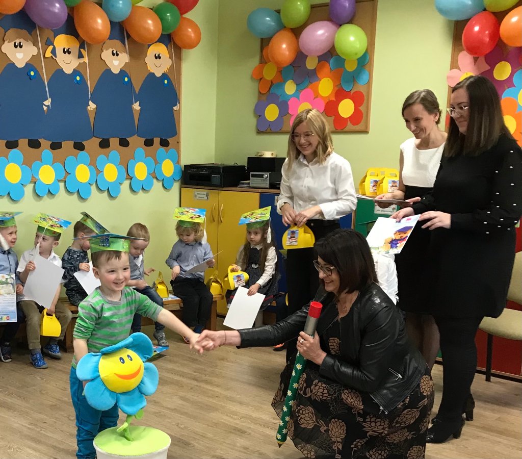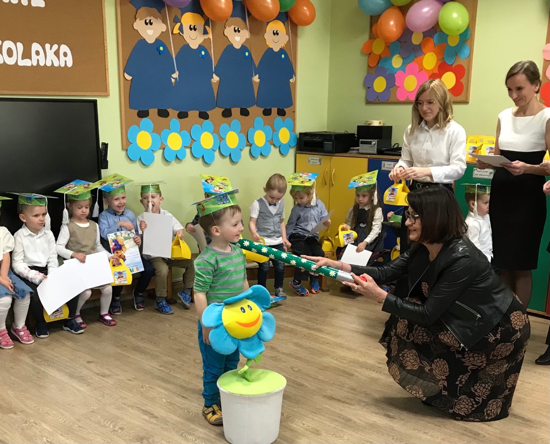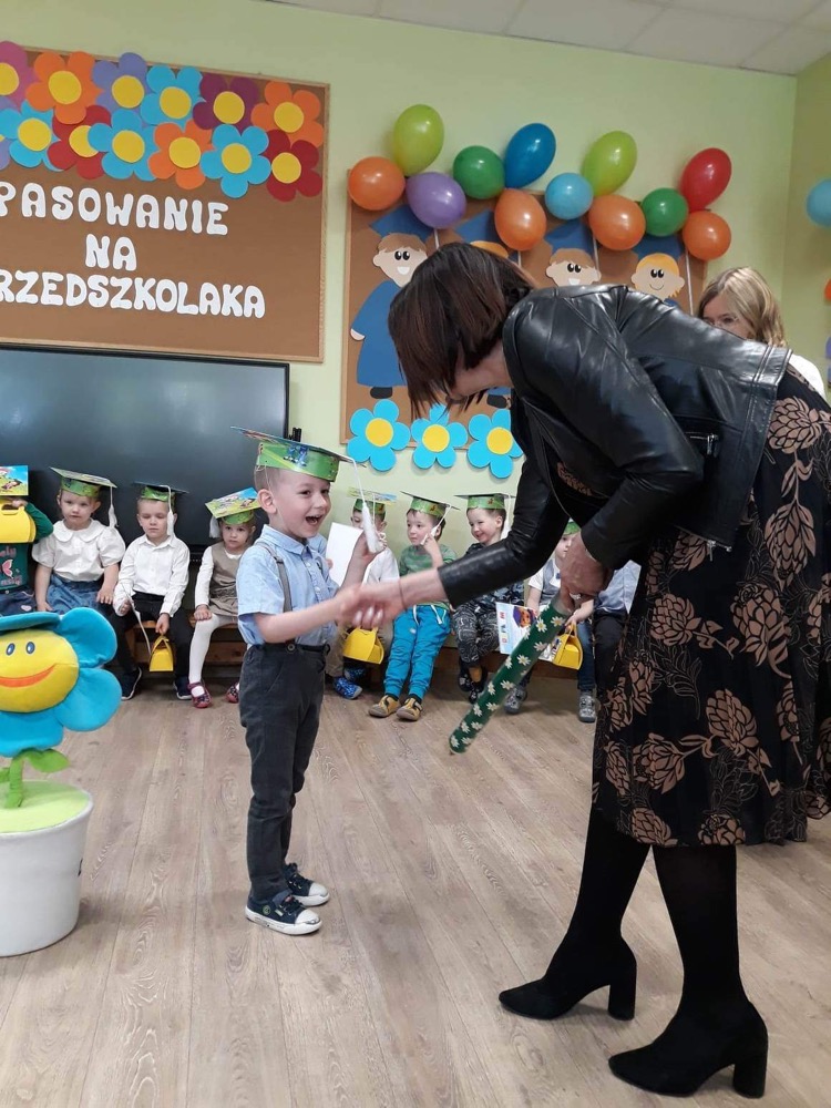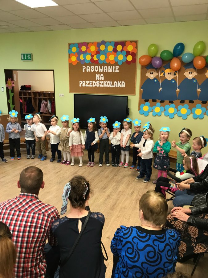 Maluszki – Kwiatuszki uczestniczyły w uroczystym Pasowaniu na przedszkolaka. Gościom maluszki zaprezentowały piosenki i Taniec Kwiatów. Po części artystycznej nastąpiło Pasowanie przez panią dyrektor przedszkola Panią Hannę Waśniewską i przewodniczącą Rady Rodziców Panią Agnieszkę Duszyńską.