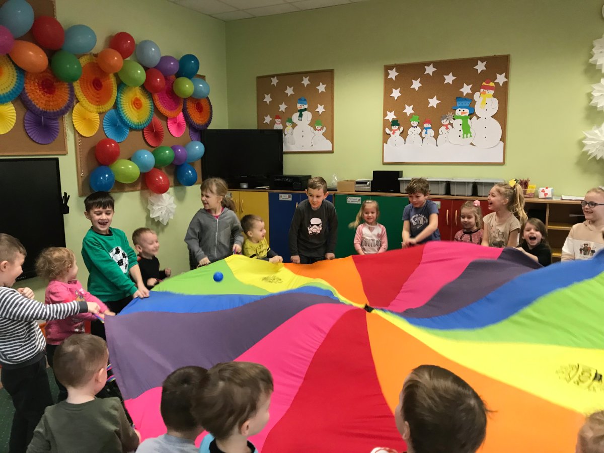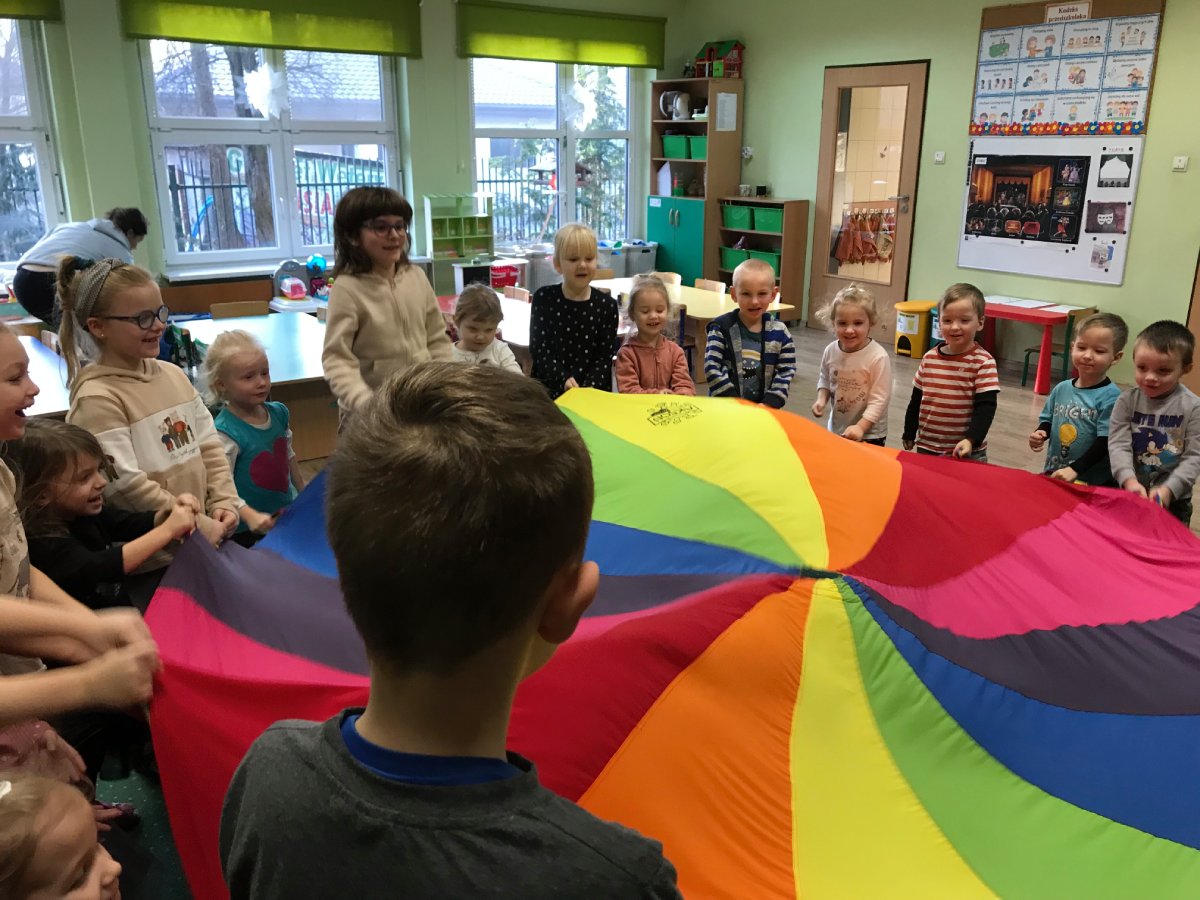 Starszaki z grupy Muchomorki i maluszki – Kwiatuszki urządziły integracyjne zabawy z balonami. Wszystkim bardzo podobały się wesołe zabawy z chustą przy muzyce.