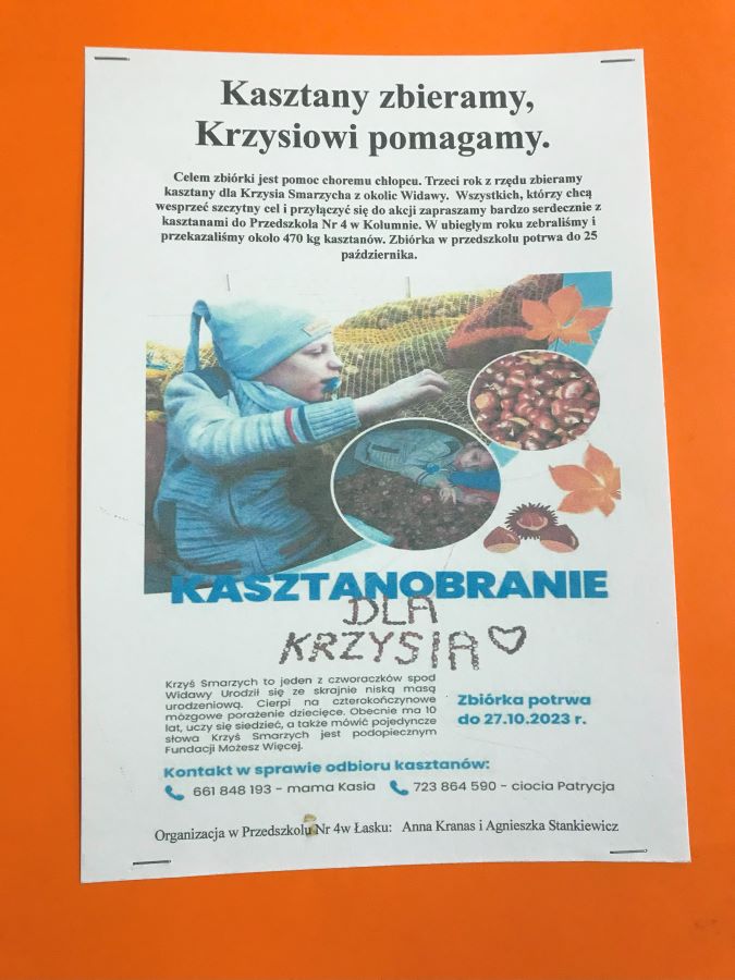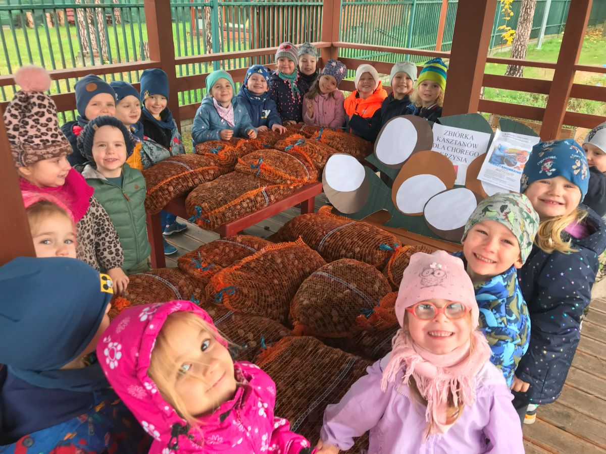 W październiku 2023 roku zakończyła się coroczna zbiórka kasztanów dla chorego Krzysia. Wszystkie przedszkolaki z rodzinami zebrały razem 490 kg kasztanów dla chorego chłopca z przeznaczeniem na jego rehabilitację. Serdecznie dziękujemy za wsparcie wspólnej zbiórki. Razem pomagamy i co rok kasztany zbieramy.