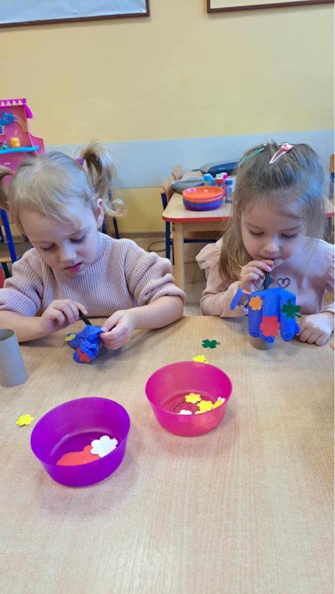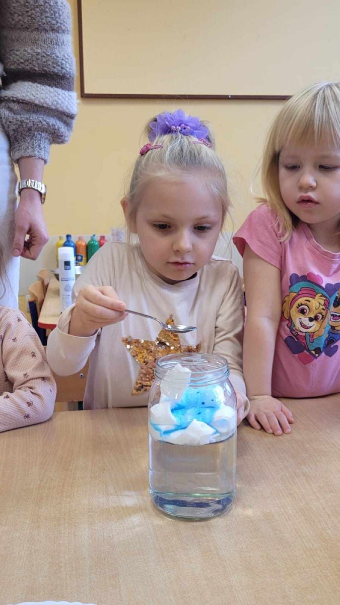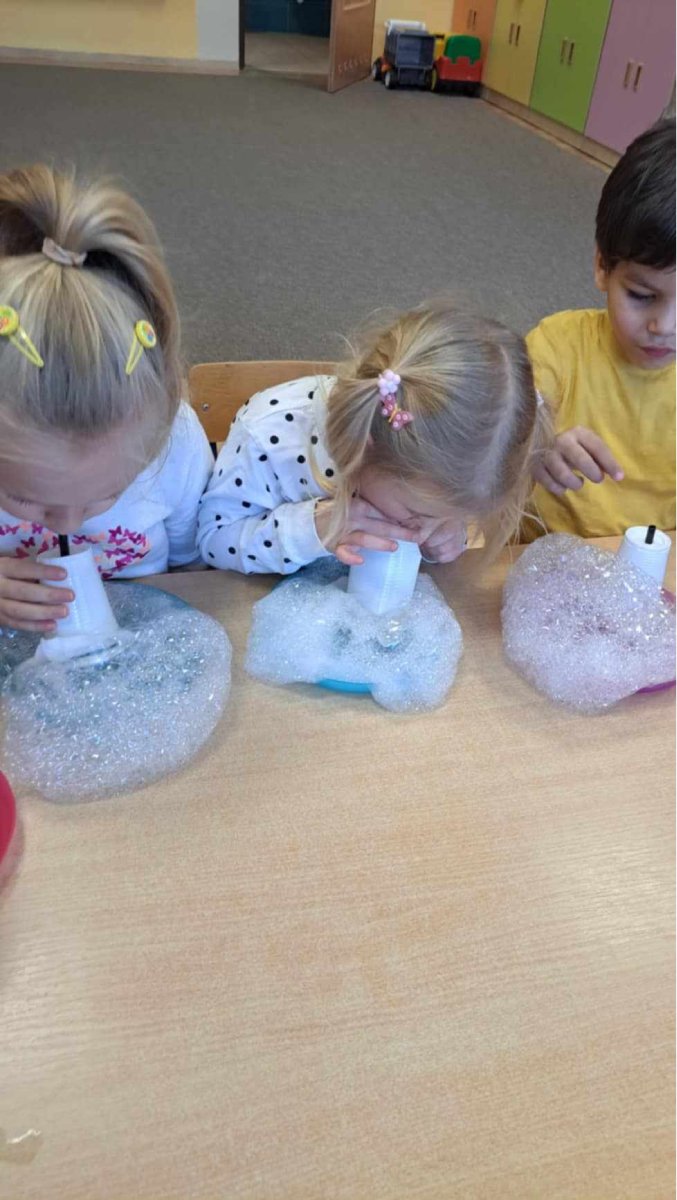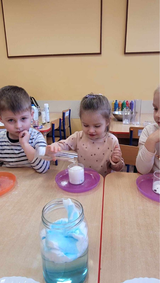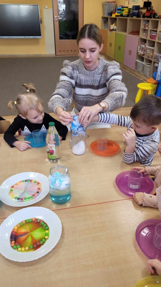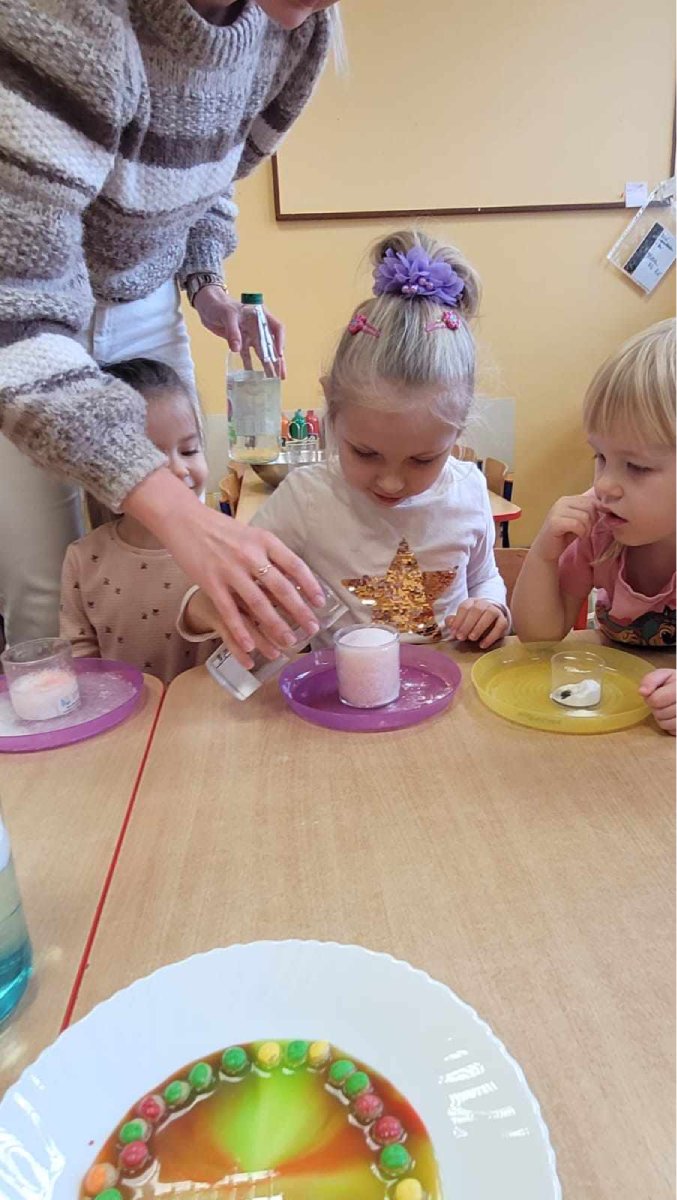 Odwiedziliśmy „wulkan kolorów”, gdzie reakcje chemiczne z użyciem sody i octu tworzyły niesamowite wybuchy kolorów, sprawiając dzieciom wiele radości i rozbawienia. Zajęcia nie tylko bawiły, ale i edukowały! Maluchy uczyły się podstawowych zasad naukowych, rozwijały swoją ciekawość świata oraz umiejętność pracy zespołowej. Każdy dzień pełen kolorowych eksperymentów umacniał naszą motylkową rodzinę, a radość z odkrywania nowych rzeczy była niezapomniana!