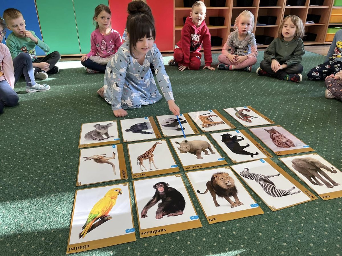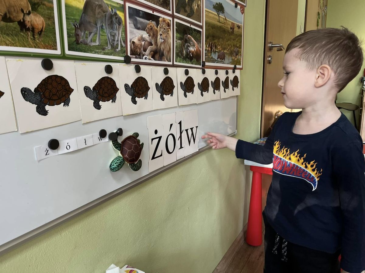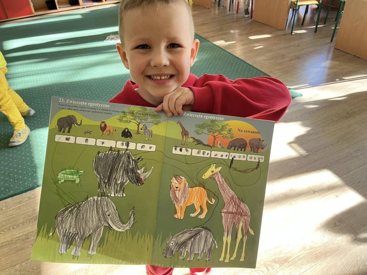 Poznawaliśmy na zajęciach zwierzęta egzotyczne i ciekawostki o nich, kreśliliśmy po śladzie, kolorowaliśmy, liczyliśmy sylaby w słowach oraz zwierzęta egzotyczne i czytaliśmy całościowo słowa oraz graliśmy w grę planszową o zwierzętach.