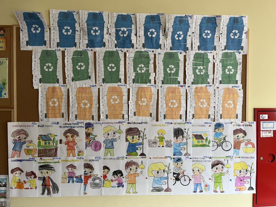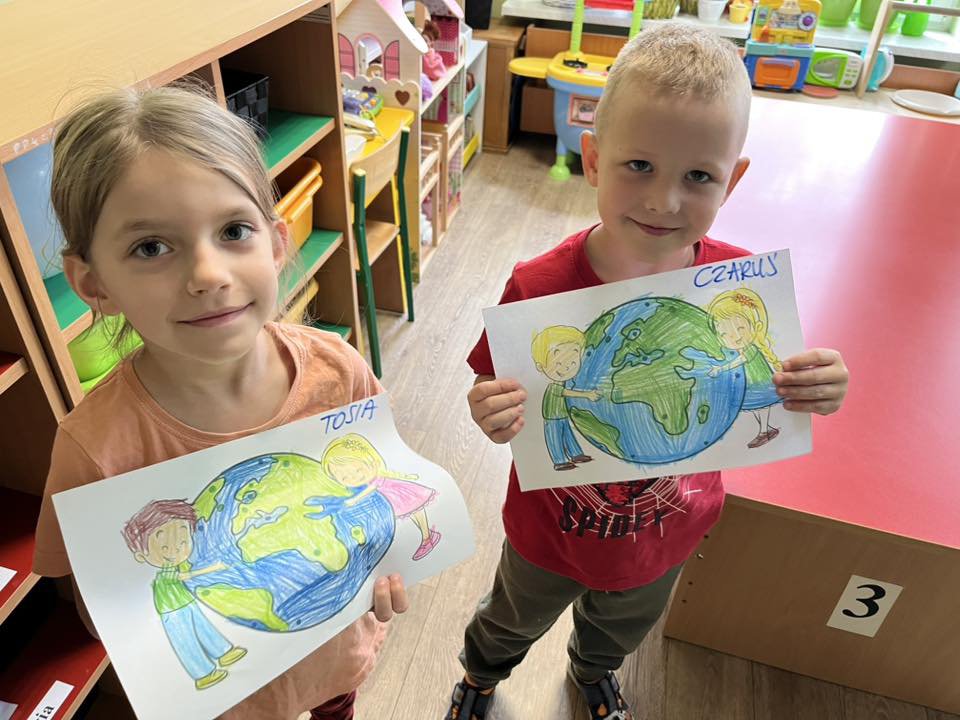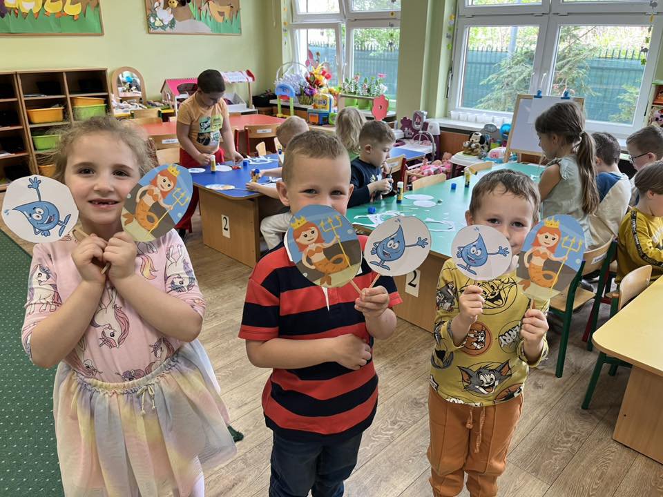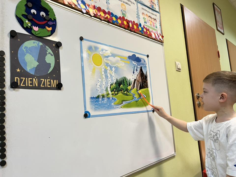 Rozmawialiśmy o przyrodzie, ekologii, dbałości o Ziemię, znaczeniu wody i czystego powietrza, recyklingu, segregowaniu odpadów, krążeniu wody w przyrodzie, sadziliśmy kwiaty w ogrodzie, wykonaliśmy ilustracje tematyczne, sylwety kropli wody oraz puzzle matematyczne.